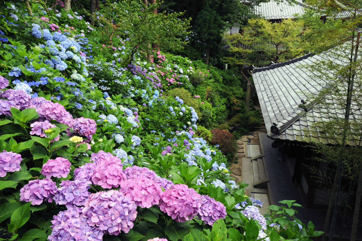 鎌倉にはアジサイの名所として知られるお寺が点在していて、梅雨時期にはアジサイを見ようと多くの人が訪れます。雨に濡れて咲くみずみずしいアジサイは一層美しく見え、梅雨時期の気分を晴れやかにしてくれるはず。歴史ある建造物を背景に咲くアジサイに情緒を感じながら、観光と合わせて鎌倉を楽しみましょう。