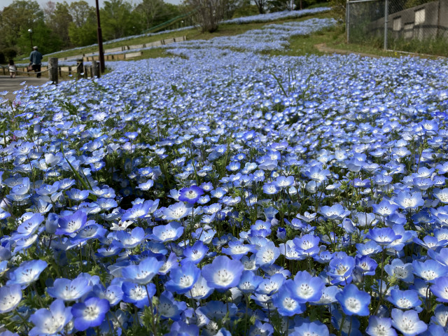 約3500㎡の花原があり、春は菜の花やネモフィラが、秋にはコスモスが開花して訪れる人を楽しませてくれます。特に3月下旬~4月下旬に見頃を迎えるネモフィラが人気で、鮮やかな青色の愛らしい花が花原一面に広がる景色は圧巻です。