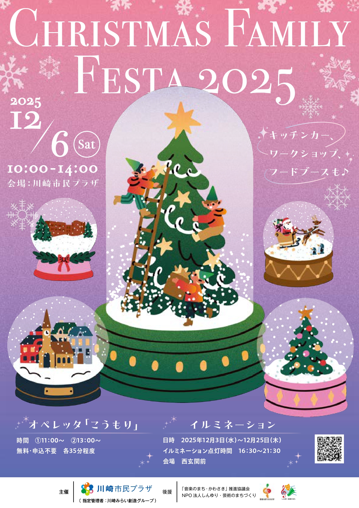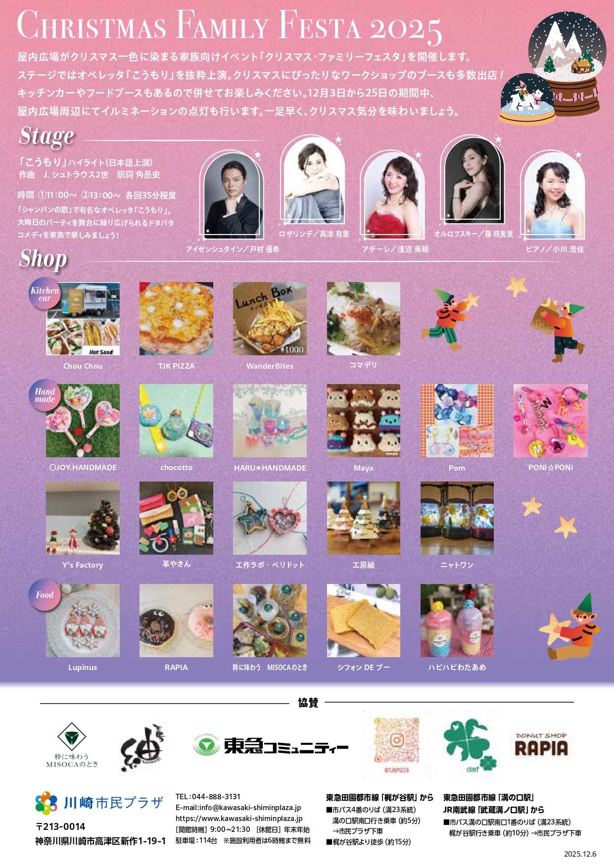 川崎市民プラザでは、屋内広場がクリスマス一色に染まる家族向けイベント「クリスマス・ファミリーフェスタ」を開催します。ステージではオペレッタ「こうもり」を抜粋上演。クリスマスにぴったりなワークショップのブースも多数出店!キッチンカーやフードブースもあるので併せてお楽しみください。また12月3日(水)から25日(木)までは屋内広場周辺にてイルミネーションの点灯も行います。一足早く、クリスマス気分を味わいましょう。