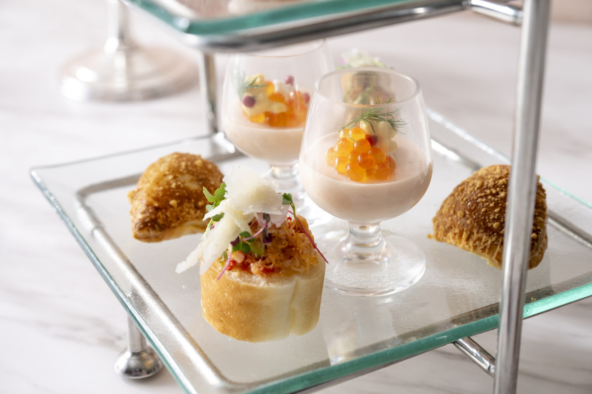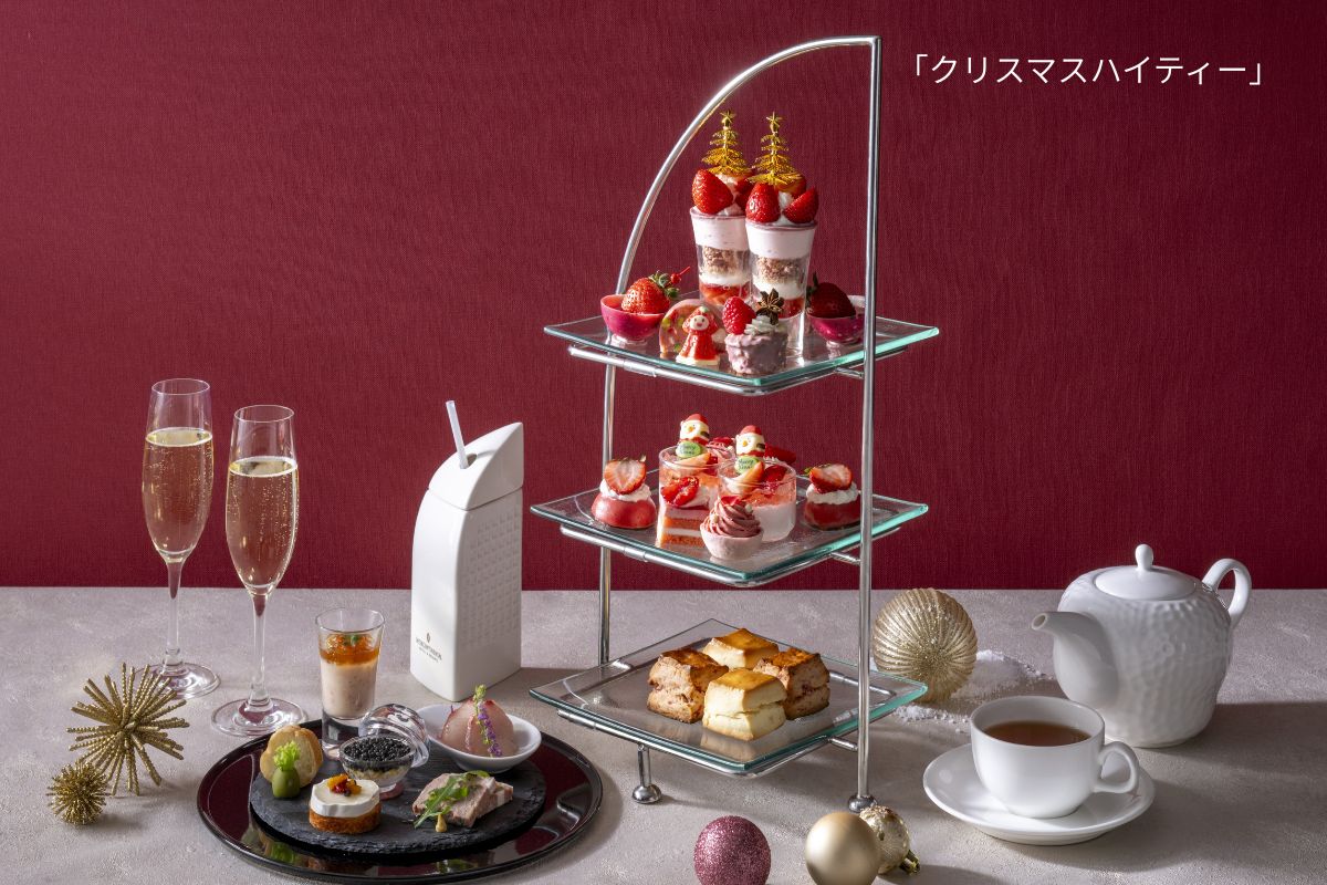 2025年12月19日(金)〜12月25日(木)の18時以降限定で、5種のオードヴルとスイーツが一緒に楽しめる英国式「ハイティー」とグラスシャンパンを堪能できる特別なプラン「クリスマスハイティー」が今年も提供されます。シャンパンで乾杯をしたあとは、クリスマスを華やかに彩るオードヴルとホテルシェイプのスタンドに並んだパティシエ特製のスイーツを楽しめます。また、お土産として持ち帰ることができるホテルシェイプのコンテナに入ったカクテルが付いたコースもご用意されています。