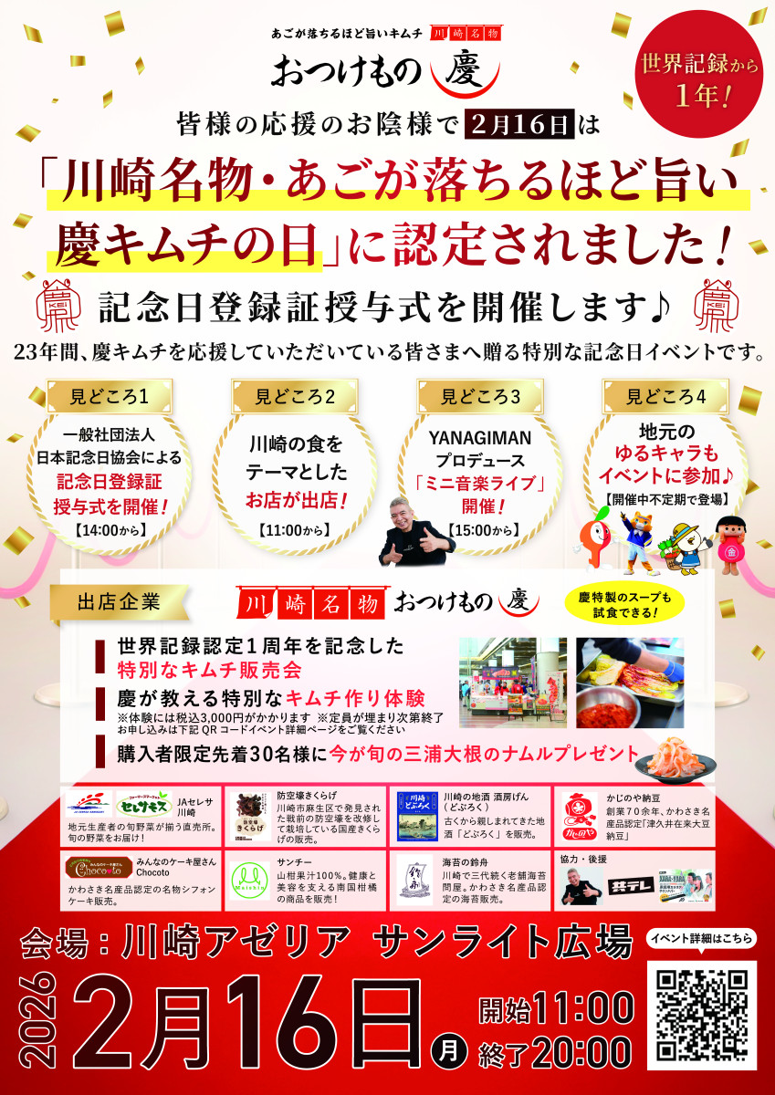 会場では、日本記念日協会による記念日登録証授与式をはじめ、川崎の食をテーマにした出店、YANAGIMANプロデュースによるミニ音楽ライブ、地元キャラクターの登場など、多彩な企画を実施。あわせて、世界記録認定1周年を記念した特別なキムチ販売会や、慶によるキムチ作り体験、購入者限定のプレゼント企画も行われます。長年応援してきた来場者へ感謝を込めた、食とにぎわいを楽しめる記念日イベントです。ぜひお立ち寄りください。