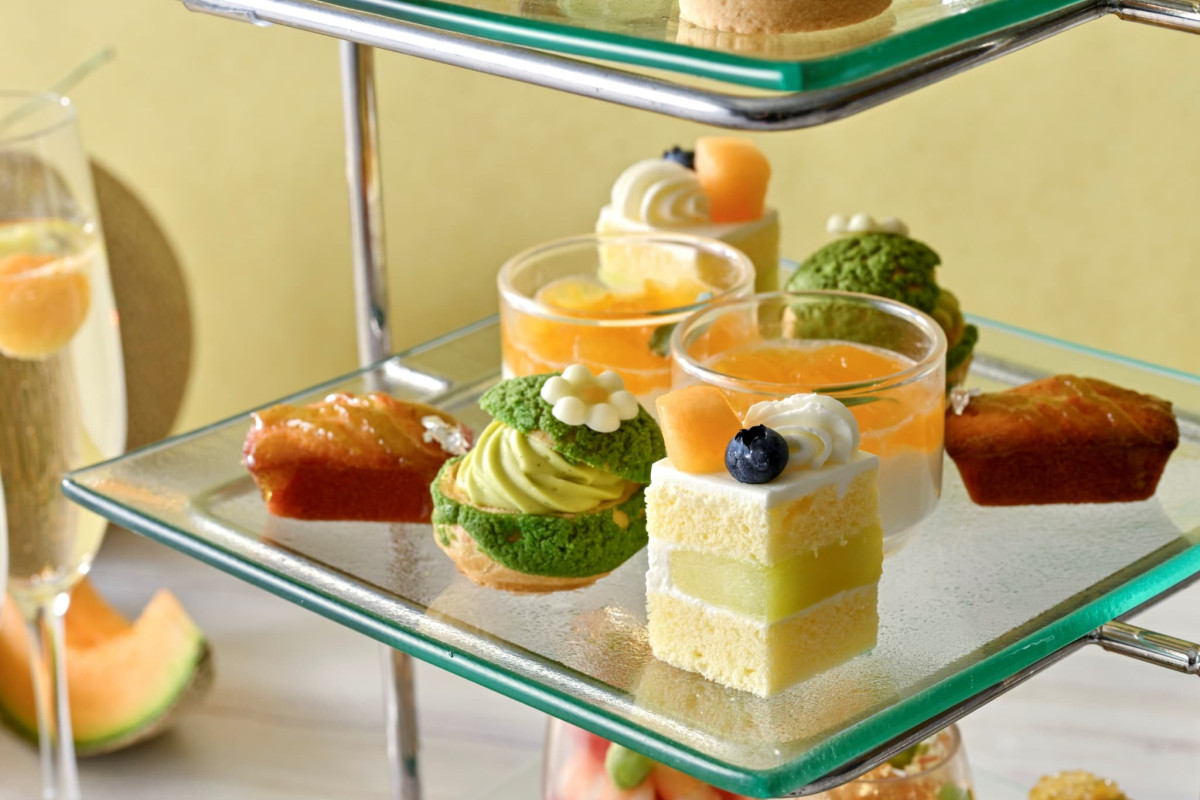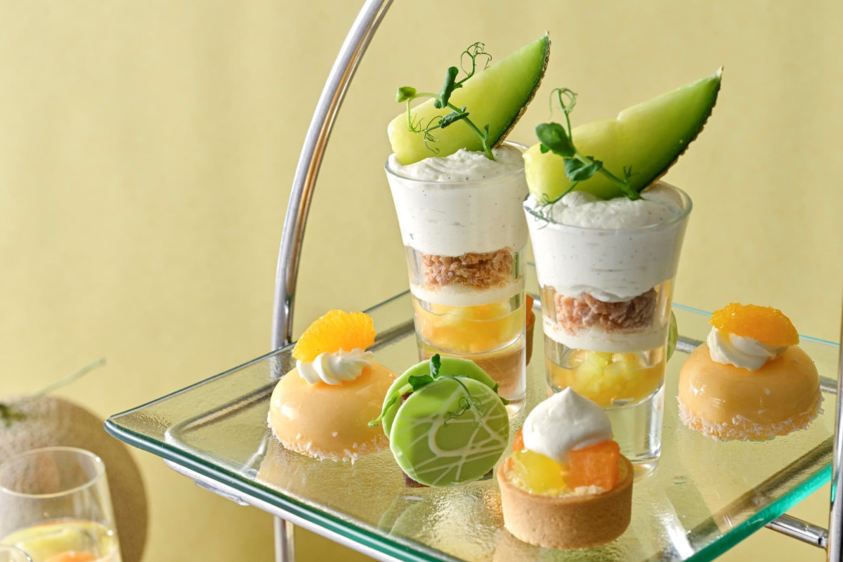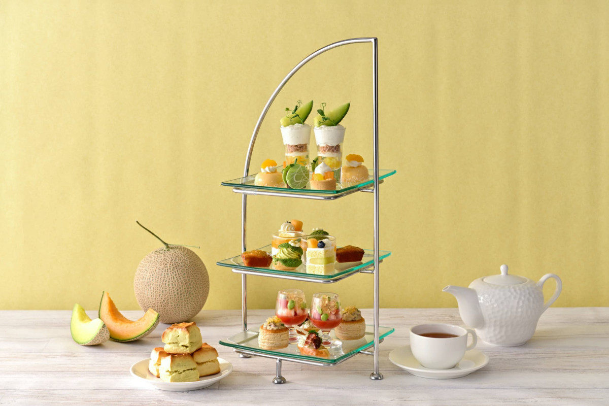 ホテルの外観をかたどったティースタンドの最上段には、赤肉と青肉メロンを細かく砕いた“コンカッセ”にマスカルポーネシャンティを重ねたグラスデザート「メロンとフロマージュのヴェリーヌ」をはじめ、メロンのグラサージュが美しく輝くムースや、紅茶が香るアーモンドクリームにフレッシュメロンをあしらったタルトなど、爽やかな甘みとやさしいコクが広がる、初夏にふさわしいスイーツが並びます。