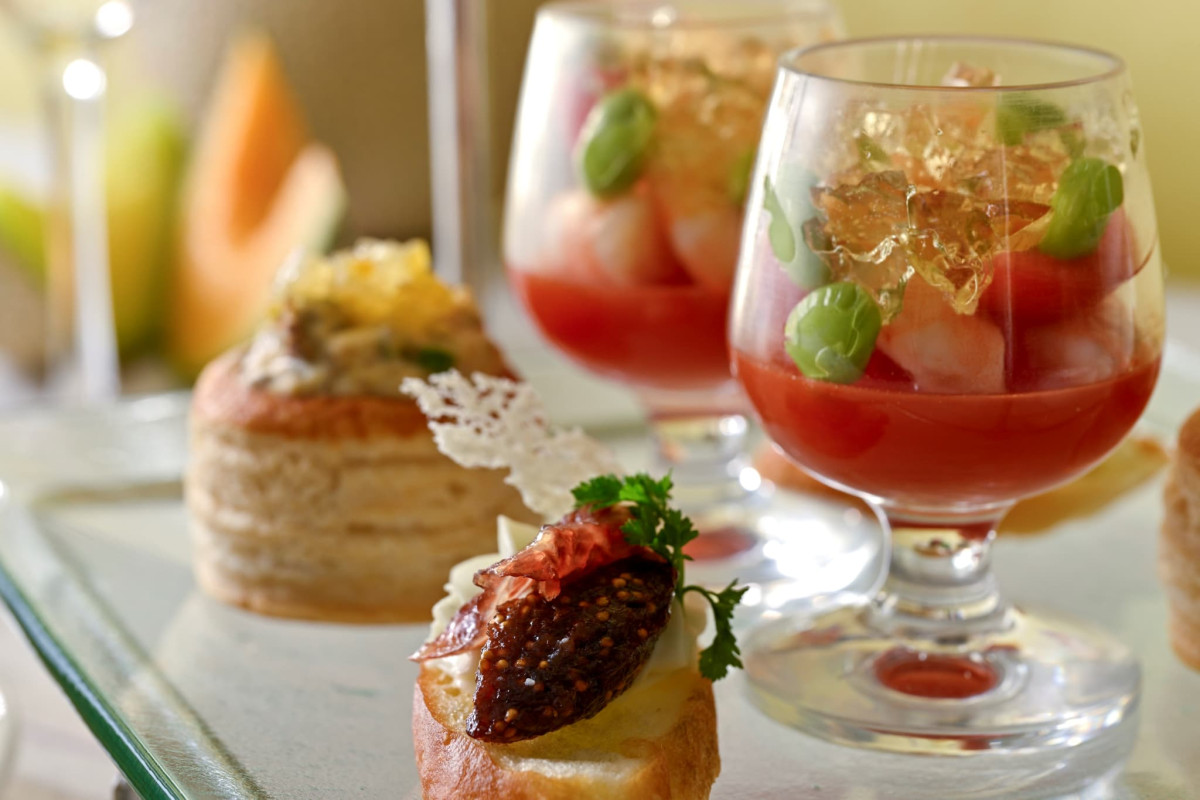 3段目のセイボリープレートには、リコッタチーズといちじくのコンポートをのせたブルスケッタをはじめ、牛肉のフリカッセを詰めたパイや、海老と枝豆をトマトゼリーで寄せた一品など、ほどよい塩味と旨みがアクセントとなるセイボリーが取り揃えられています。