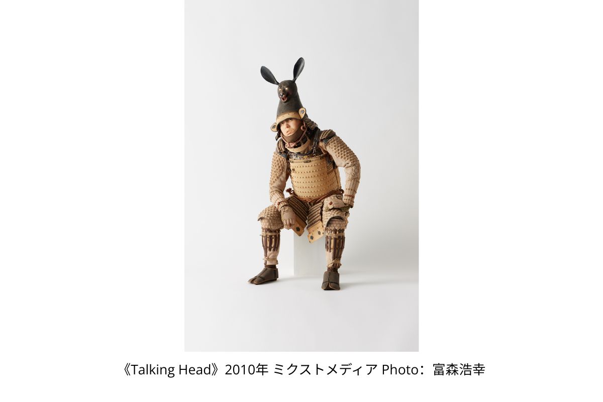 作品は一見古びて見えますが、すべて樹脂やアクリルといった現代的な素材で作られており、「リアリティー」「多様性」など作家のコンセプトが凝縮されています。まるで本物と見間違うような肌質の彫刻は、近代日本美術にある芝居的な表情とは違い、アイロニーな印象で、見る人の想像力を刺激します。モチーフは鎧兜ですが、過去や現代、未来を生きる人間の姿を肯定的に捉えています。