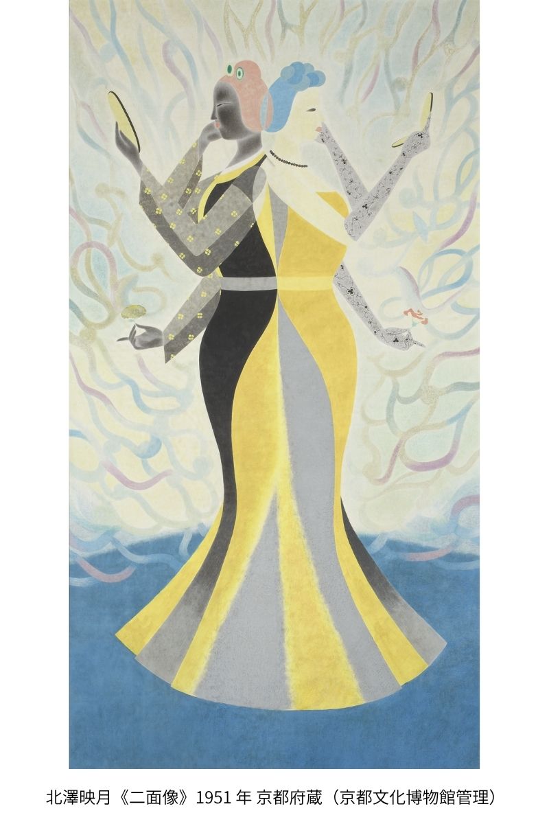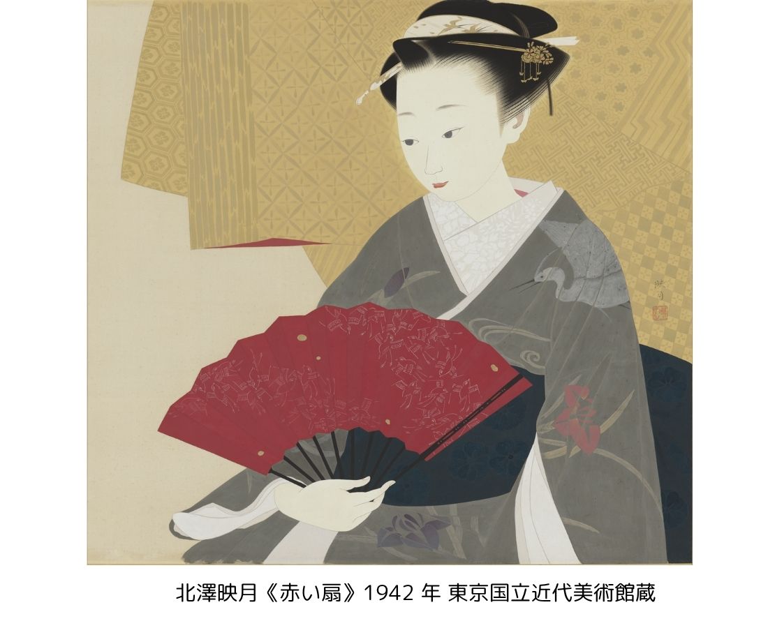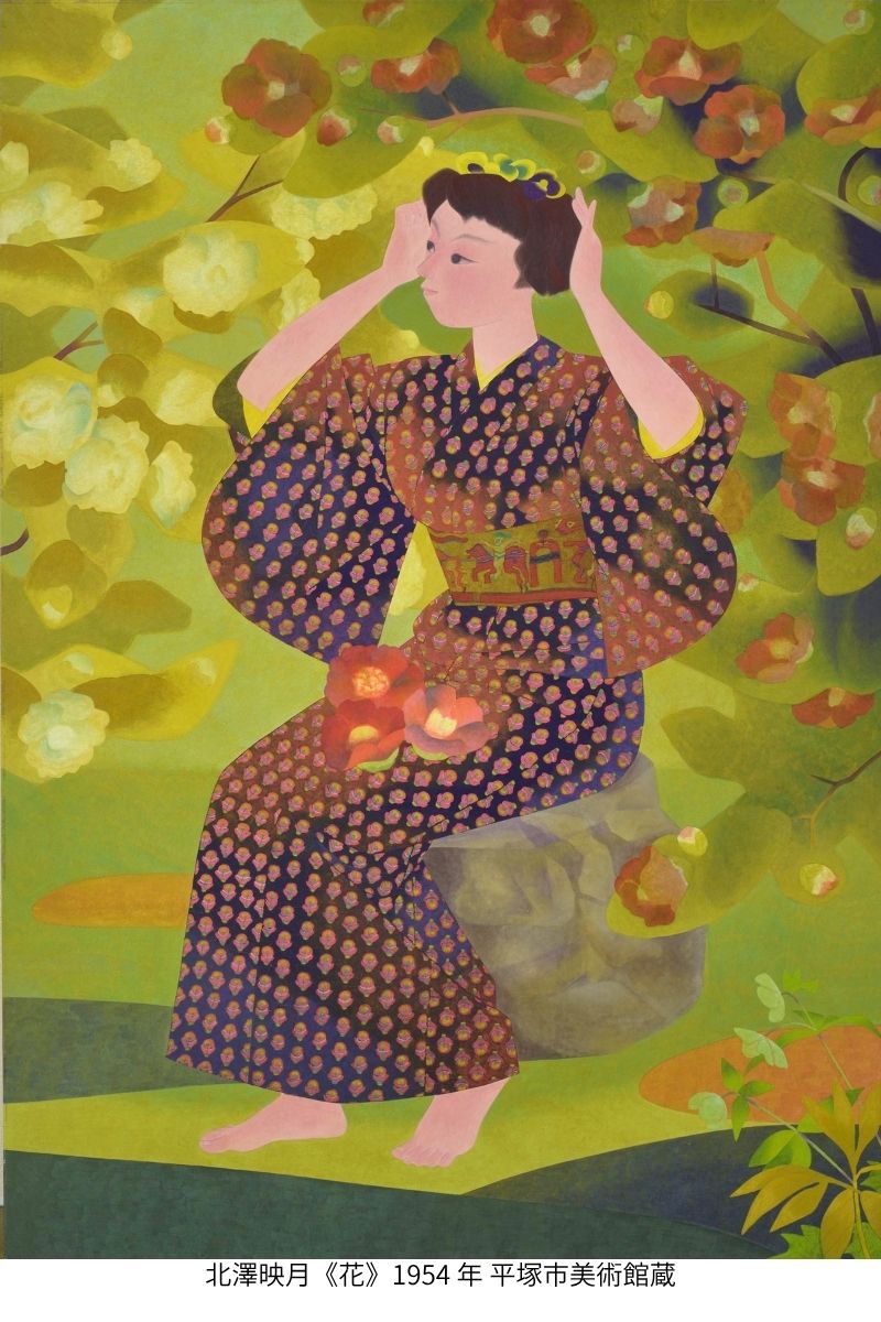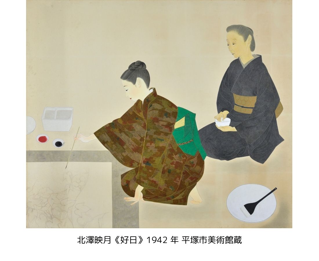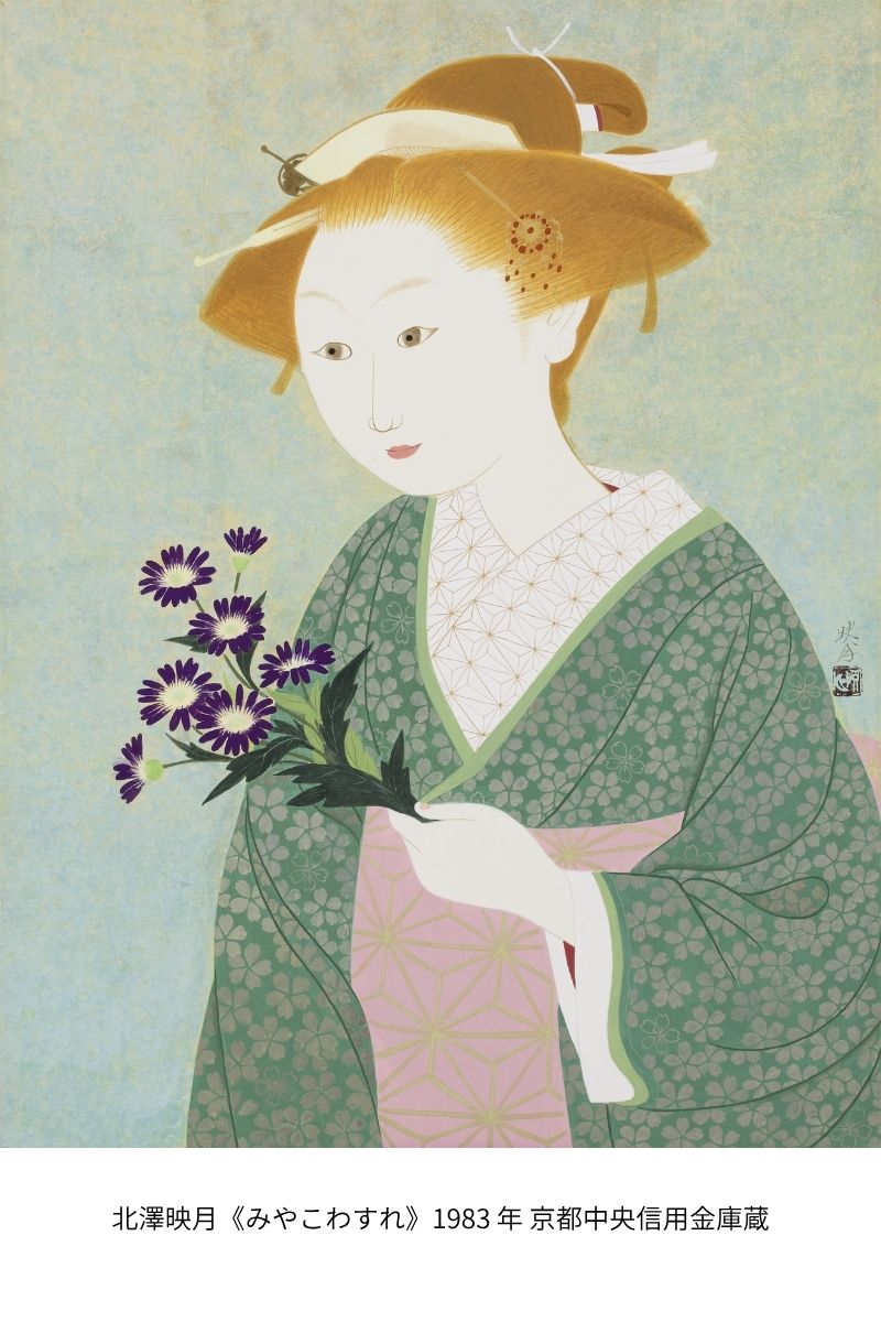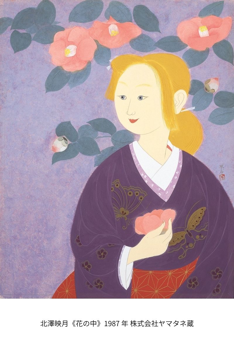 北澤映月(きたざわえいげつ・1907-1990)は京都市に生まれ、上村松園(うえむらしょうえん)や土田麦僊(つちだばくせん)に師事して本格的に日本画家として歩み始めます。麦僊没後の1938年から再興院展に入選を重ね、1941年には小倉遊亀(おぐらゆき)に続く女性二人目の日本美術院同人に推挙されました。