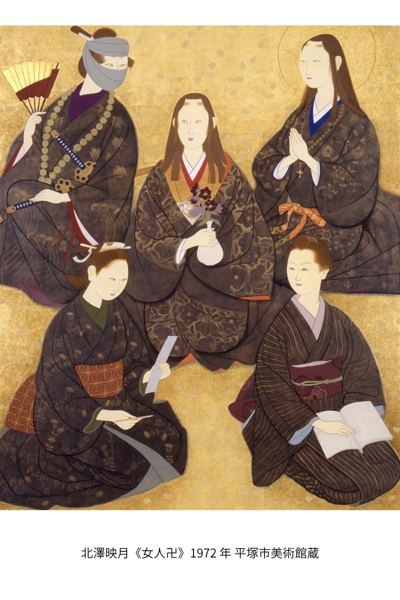 一貫して女性像をテーマとし、はじめ性格描写に優れた人物表現を行っていましたが、戦後は現代的な女性風俗を扱いながら、西洋絵画の影響を受けて重厚な色面表現へと移行します。この間、小林古径(こばやしこけい)や安田靫彦(やすだゆきひこ)の薫陶を受けつつ制作に邁進し、1960年には住み慣れた京都を離れて東京に移住しました。1970年代にはいると、細川ガラシャや淀君などの歴史人物に取材して、そこに映月独自の女性観を加味した華麗かつ情感豊かな画境へと達しました。現代的で清新な作品には、装飾性と写実性がバランスよく共存し、映月が志向した健康的で知的な女性が巧みな構成や艶やかな色彩によって表されています。