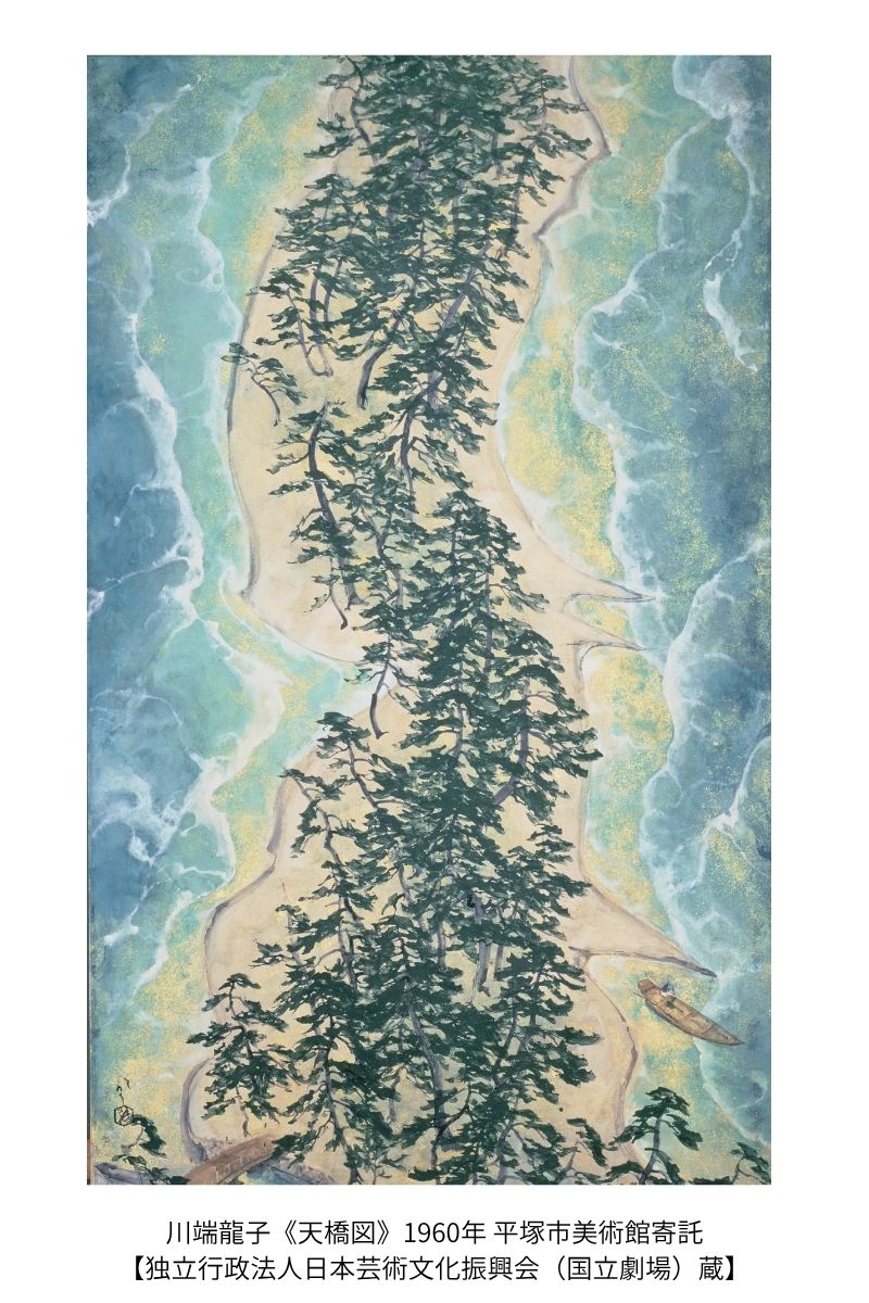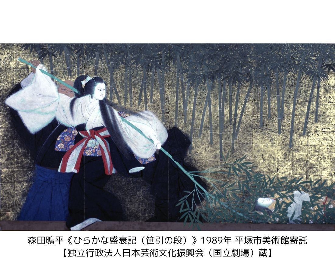 国立劇場は、日本の伝統芸能の保存と振興のため、1966年に設立された日本初の「国立」の劇場です。明治初期の日本の近代国家の幕開けとともに、西洋に倣った官立の劇場施設が切望され、長い時を経て待望の開場を果たしました。その場内には、日本画を中心とした当時の画壇最高峰の作家による作品が集められ、格調高い趣を作り出す一翼を担い続けました。近現代の日本画の収集・展示を積極的に行っている平塚市美術館では、国立劇場の再整備等事業のための閉場期間中、これらの作品を預かり、本展では全36点を一堂に展示します。