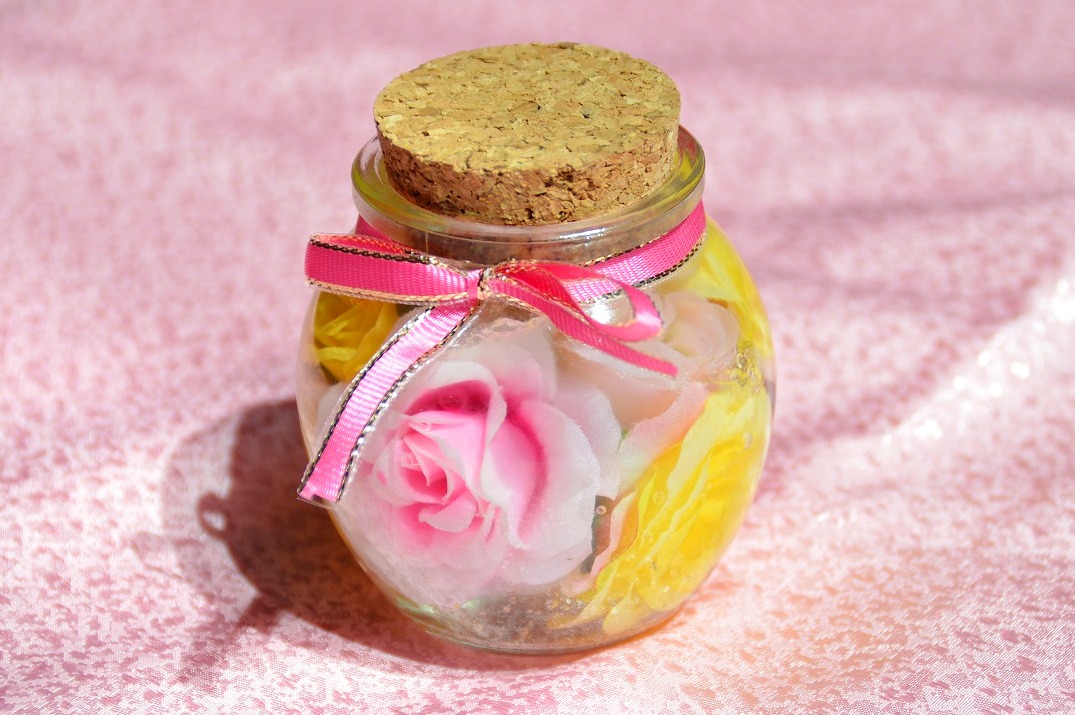 瓶のなかにバラの造花を飾り、バラのエッセンシャルオイルで香りをつけて、