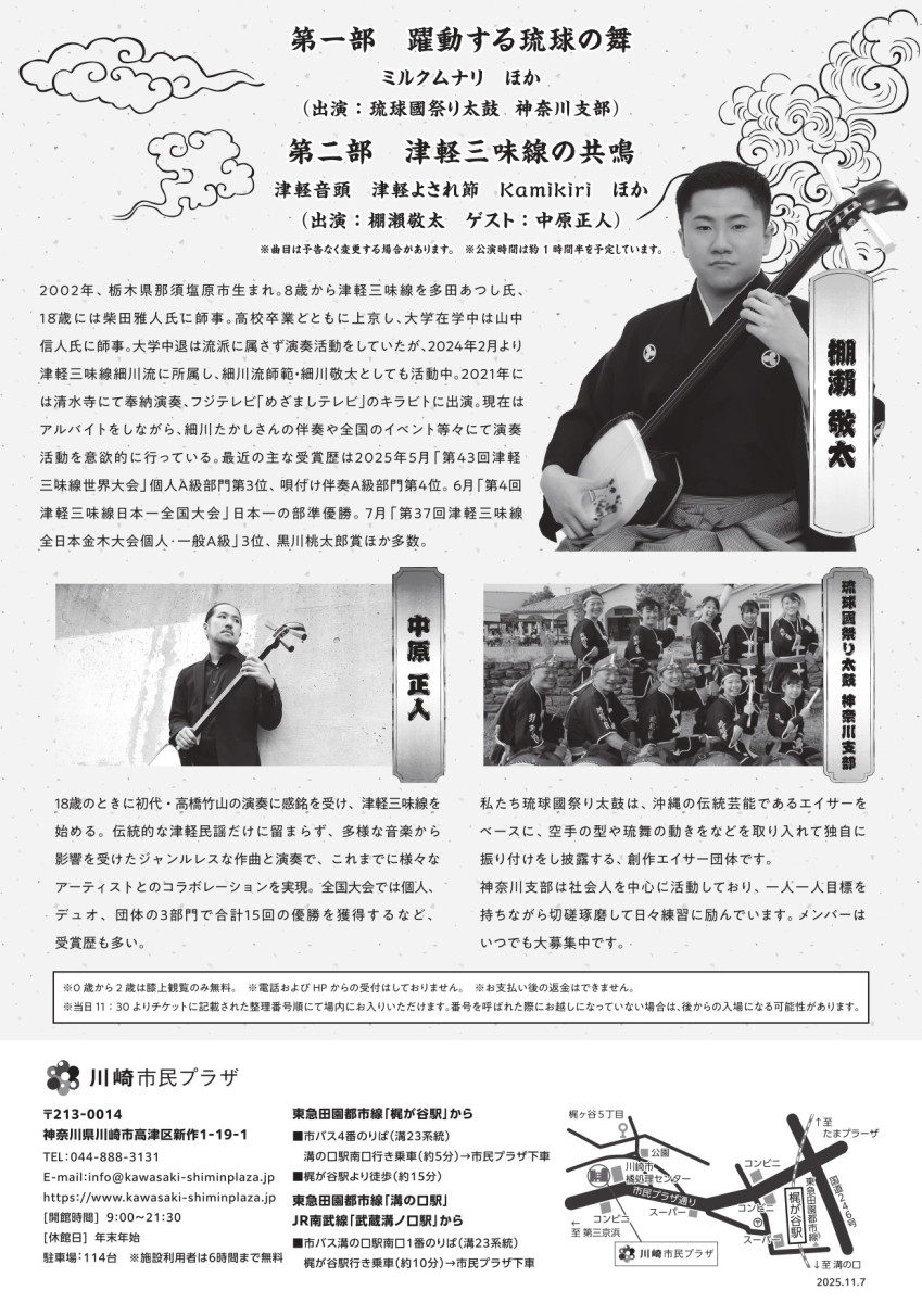 川崎市民プラザでは、文化事業の一環として、2025年11月7日(金)に和楽器のコンサート「ニッポンの調べ そのさん~津軽三味線×エイサーこんさあと~」を開催します。