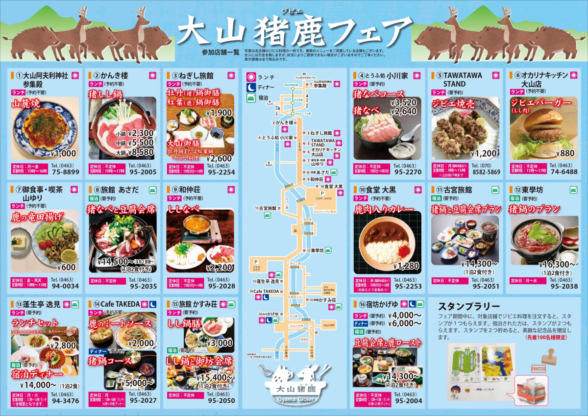 本イベントは、大山地区の特産品であるジビエを多くの方に知ってもらうことを目的としたイベントであり、期間中は、景品付きスタンプラリーを実施します。