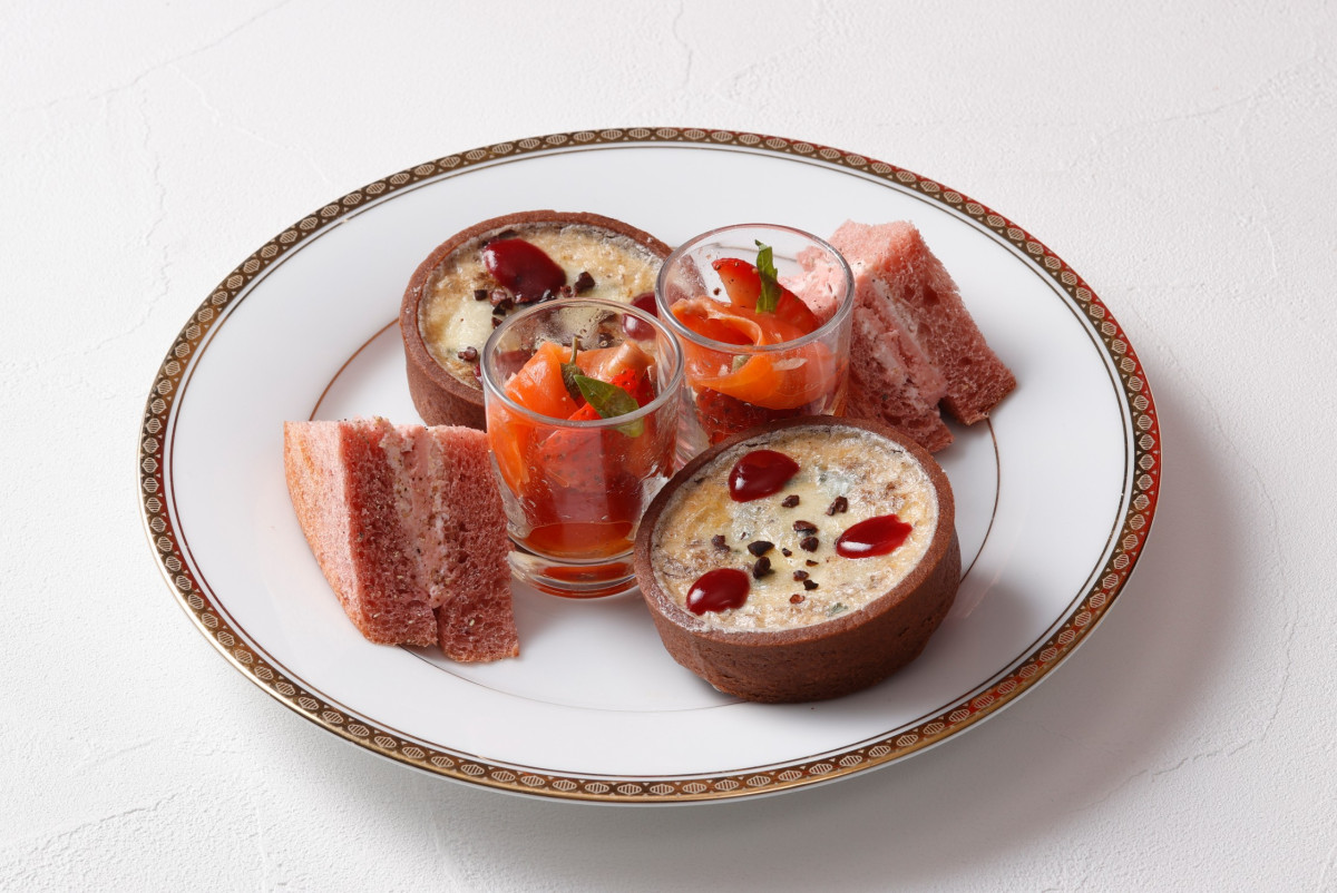 グラスに苺とラズベリーのジュレとチョコレートパンナコッタを重ねエルダーフラワーゼリーをトッピングしたヴェリーヌや、苺のバタークリームで仕上げたオペラのほか、ミルフィーユやマカロン、ガナッシュなど、バリエーション豊かな愛らしい苺スイーツがティースタンドを彩ります。セイボリーは、サワークリームと黒胡椒がアクセントの苺とラズベリーのバターサンドや、牛ほほ肉とブルーチーズを使用したキッシュ、苺とスモークサーモンの相性抜群なサラダと、個性豊かなメニューです。甘い香りの苺の魅力をたっぷり詰め込んだ“苺尽くし”のアフタヌーンティーをお楽しみください。