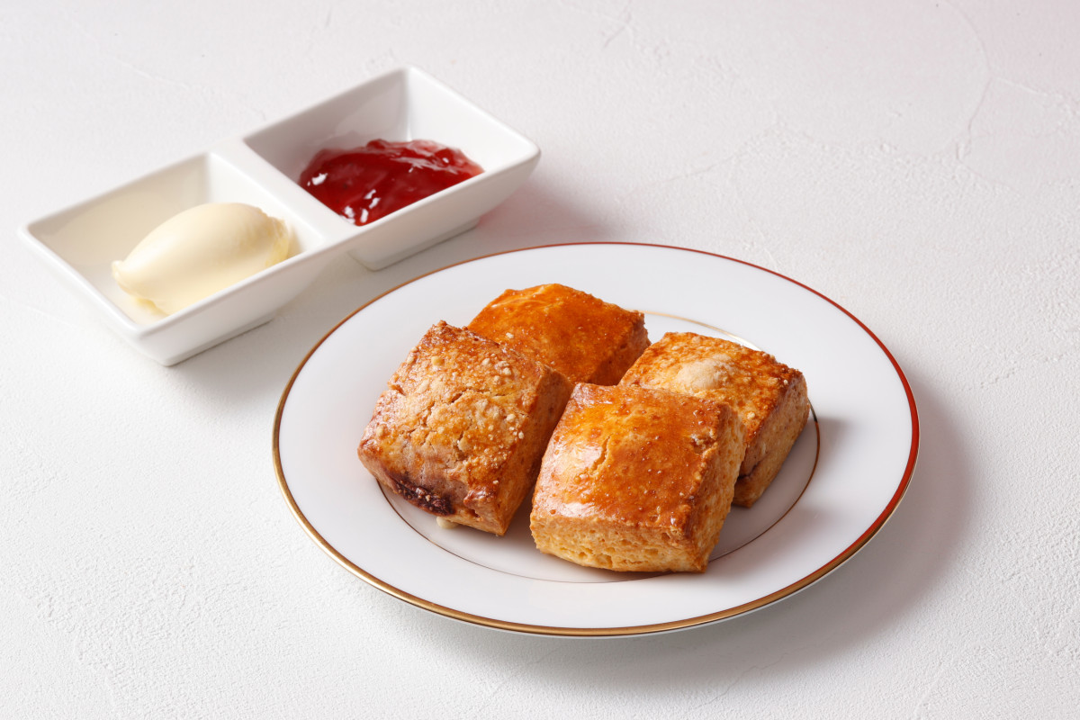 アフタヌーンティーで好評のホテルメイドスコーンをお持ち帰り用として販売しています。季節ごとに変わる限定フレーバーとプレーンの2種を各2個ずつ、計4個入りでご用意。外は香ばしくサクサク、中はしっとりとした食感が魅力で、朝食やティータイムにおすすめです。