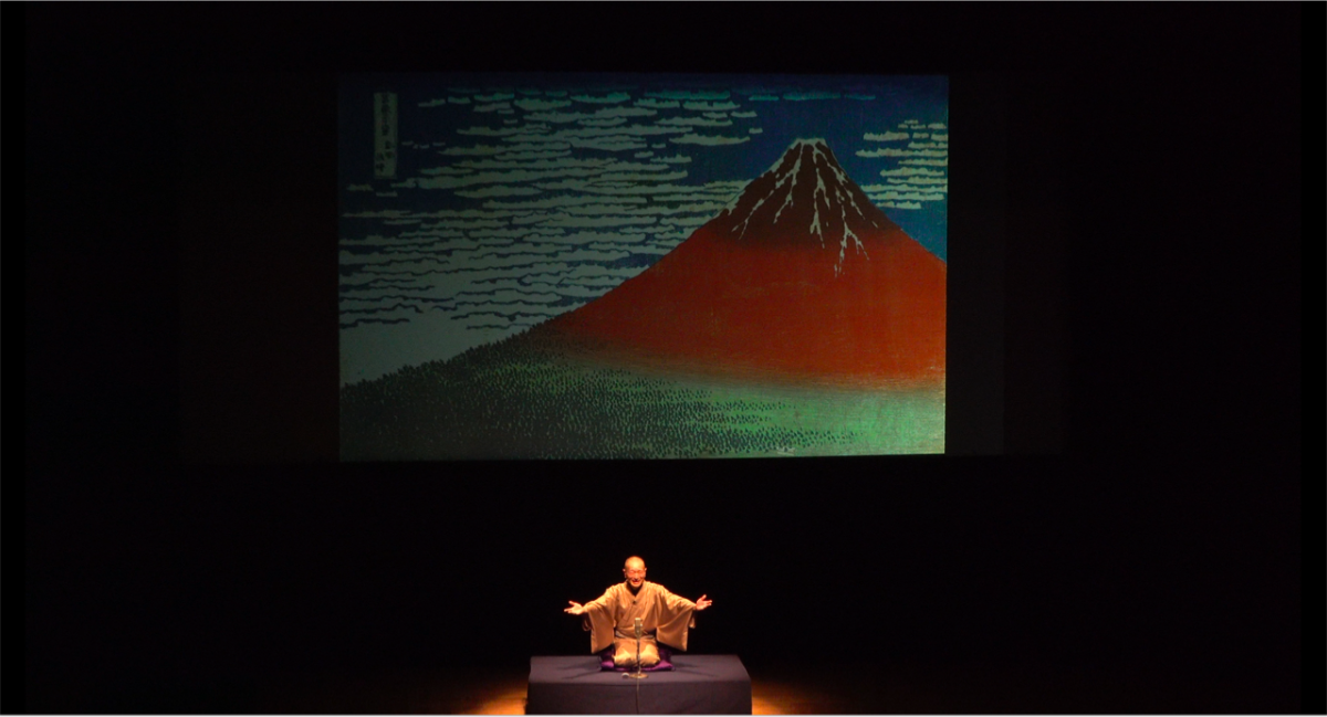 江戸っ子が富士をめざす落語の旅噺を改作して、大画面の浮世絵とコラボさせて演出します。