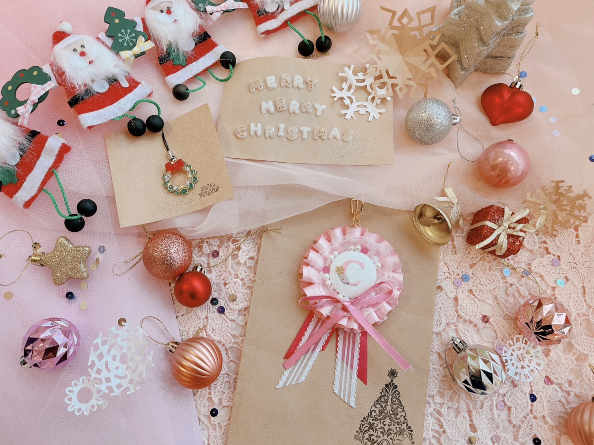 クリスマス限定のデコレーションパーツを使った、かわいくてきれいなUVレジンアクセサリーやロゼットキーホルダーづくりが体験できるワークショップです。