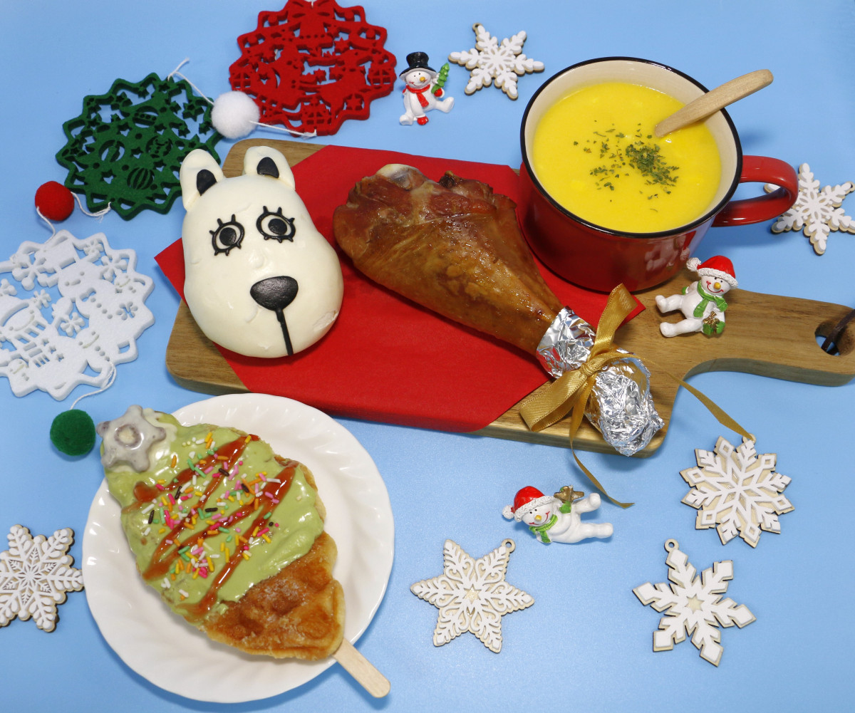 ターキーレッグや温かいスープなど、クリスマスの遊園地にぴったりなワンハンドメニューを多数取り揃えています。また今年は、マスコットキャラクターのグッドをモチーフにした「グッドのカスタードまん」も新たに販売します。
