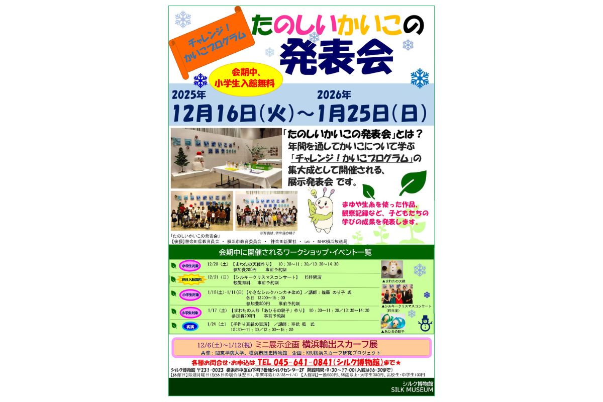 当プログラムの集大成として、2025年12年16日(火)~2026年1月25日(日)の期間に、学習の展示発表会「たのしいかいこの発表会」を開催します(会期中、小学生入館無料)。