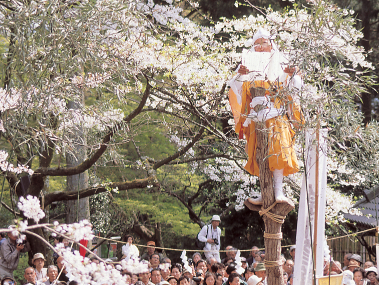 日向薬師(神奈川県伊勢原市)の春季例大祭は、毎年4月15日に開催される「かながわのまつり50選」に選ばれた伝統行事です。山伏(修験者)による高さ5mのしいの木に登る「神木(しぎ)のぼり」や火渡り、本尊・鉈彫薬師三尊像の開帳が行われる、最も盛大な祭りです。