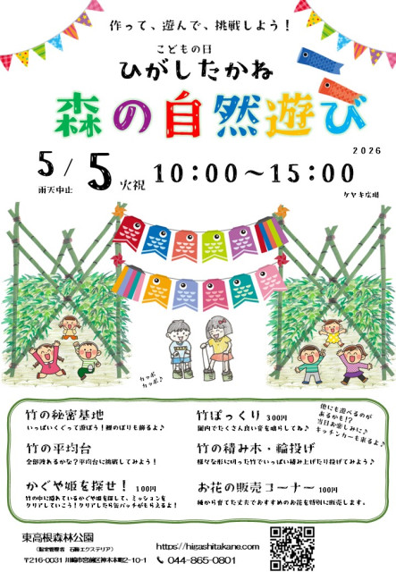 県立東高根森林公園 5/5 G.W.こどもの日「森の自然遊び」【川崎市】川崎市宮前区の東高根森林公園では、ゴールデンウィークにあわせて親子で楽しめる自然体験イベントを開催します。新緑に包まれた園内で、のびのびと体を動かしながら、森の魅力を体感できる内容が盛りだくさん。当日はキッチンカーの出店もあり、食も楽しめます。家族での思い出づくりにぴったりのイベントです。概要■開催日:2026年5月5日(火・祝)■時間:10:00~15:00(予定)■会場:東高根森林公園(ケヤキ広場ほか)■内容:自然遊び体験、親子向けアクティビティ など■参加費:無料(※一部有料プログラムあり)■対象:子どもから大人まで■主催:東高根森林公園【県立東高根森林公園について】川崎市宮前区に位置し、川崎市内唯一の県立公園です。神奈川県の天然記念物のシラカシ林や、弥生時代の集落跡である東高根遺跡(古代芝生広場)があります。また、園内には花の見どころも多く、湿生植物園など季節に応じた自然の歳時を見ることができます。