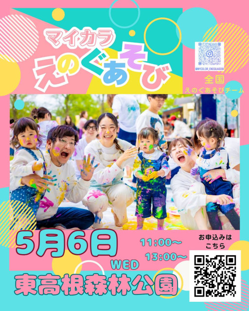 県立東高根森林公園 5/6 G.W.企画「マイカラえのぐあそび」【川崎市】川崎市宮前区の東高根森林公園では、ゴールデンウィークにあわせて、青空の下で楽しめる体験型イベント「マイカラえのぐあそび」を開催します。新緑に囲まれた開放的な空間で、全身を使ってのびのびと自由にえのぐ遊びを体験ができるイベントです。 概要■開催日:2026年5月6日(水・振休)■時間:第一部 11:00~12:00/第二部 13:00~14:00■会場:東高根森林公園(けやき広場)■参加費:1人 1,000円■申込:事前予約制(下段のウェブサイトよりお申込みください)■対象:親子参加(※小学3年生未満のお子さまは保護者同伴必須)■持ち物:汚れてもよい服装、着替え、タオル、ウエットティッシュ、ビニール袋、飲み物■備考:当日レインコート購入可(1着100円) 【県立東高根森林公園について】川崎市宮前区に位置し、川崎市内唯一の県立公園です。神奈川県の天然記念物であるシラカシ林や、弥生時代の集落跡である東高根遺跡(古代芝生広場)など、貴重な自然と歴史が共存しています。園内には湿生植物園など四季折々の自然を楽しめるスポットもあり、散策にも最適な公園です。