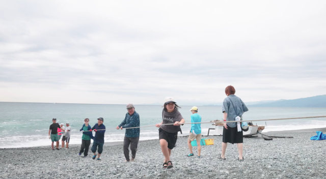 湘南地引網 市五郎丸【二宮町】神奈川県二宮町。JR東海道線二宮駅より徒歩約7分の袖が浦海岸で地引網体験をお楽しみください。最高のロケーションの中、会社や地域のイベント、体験学習や修学旅行など幅広くご利用いただいております。丁寧にご説明しますので初めての方でも安心です。綱引きの要領でロープを引くだけですのでお子様から大人までみんなで楽しむことができます。地引網が海岸に上がってきた時の迫力や「何が網にかかったのか」というワクワク感が魅力です。また、網にかかった海の生き物に直接触れられるため生物や自然、食についても学習できる貴重な経験になります。「手ぶらでバーベキュー」プランも大変人気です。「湘南しらす」は絶品ですよ♪