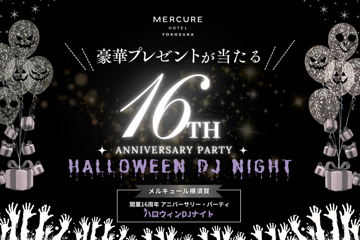 メルキュール横須賀開業16周年を記念して、ホテルならではのラグジュアリー空間で楽しむ一夜限りのハロウィンパーティ開催!DJやライブ、豪華ブッフェに加え、360度セルフィーステージも登場します。