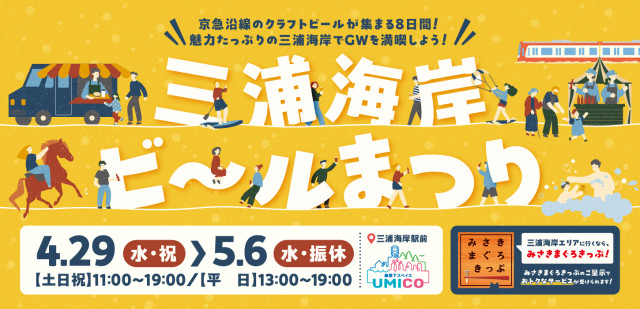 三浦海岸ビールまつり20262024年の初開催から数えて今回で3回目を迎え、三浦海岸エリアのゴールデンウィークを彩るイベントとして定着している、「三浦海岸ビールまつり」。 このイベントは三崎港の「三浦ブルワリー」を中心に呼びかけた沿線のブルワリーが集合するビールまつりです。また、「三浦海岸まちなみ事業協議会」が毎週土曜日に開催している「トラック市」が同時開催されます。 詳しくは京急のnewcalをご確認ください。 開催日時 2026年4月29日(水・祝)~5月6日(水・振休)計8日間平日:13:00~19:00 土日祝:11:00~19:00※雨天決行・荒天中止※同期間中、『三浦海岸トラック市』も開催!地元三浦の新鮮野菜や特産品を販売します。 開催場所 三浦海岸駅前地域交流拠点「線路下スぺイスUMICO」 イベントトピックス ビールまつり ・日替わりで合計9つのブルワリーが登場!三崎の自慢の一杯から沿線で愛される本格派クラフトビールまで、多彩な味わいを飲み比べることができます。・三浦半島の人気店が日替わりで出店。ビールに合うフードをご提供します。 トラック市 ・地元三浦の新鮮野菜や特産品が並びます。 体験イベント ・ビールとタロットによる「ビール占い(ルッぱらかなえ)」が今年も登場・アメリカ生まれのパーティースポーツ「コーンホール」体験を初開催・【5月3日(日)・4日(月・祝)】ブラジル発祥の武術「カポエイラ」のパフォーマンスを初実施!当日は、カポエイラ界を代表する2名が来日し、迫力ある演武を披露します。 詳しくは京急のnewcalをご確認ください。 クラフトビール(日替わりで9社が出店予定) 三浦半島・京急沿線の実力派ブルワリーがこだわりの一杯をお届けします。 詳しくは京急のnewcalをご確認ください。 フード(日替わり出店) 三浦半島の人気店がビールに合う特製メニューを提供。 1 Rokks 4月30日(木)、5月1日(金)、5月3日(日)~4日(月・祝) 2 丘の上のお弁当屋さん 5月5日(火・祝)~6日(水・振休) 3 邦栄堂 5月6日(水・振休) 4 Daddy’s Pizza 4月29日(水・祝)、5月3日(日)~4日(月・祝) 5 だるま食堂 5月2日(土)~5日(火・祝) 6 かんかんのとり天 4月29日(水・祝)、5月5日(火・祝)~6日(水・振休) 7 提灯東京 4月29日(水・祝)~5月6日(水・振休) 8 Pulu pulu pulpo! 4月30日(木)~5月1日(金) 9 Cafe 134 4月29日(水・祝)、5月2日(土)~6日(水・振休) 詳しくは京急のnewcalをご確認ください。 ※当日、出店キャンセルの場合もございますので、予めご了承ください。 イベント ビール占い「ルッぱらかなえ」ビールとタロットカードを使った運勢占いが今年も登場します。ルッぱらかなえインスタグラム▹URL:https://www.instagram.com/kanaekobayashi1128/ コーンホール体験会 ※雨天中止アメリカ生まれのパーティースポーツ「コーンホール」の体験会を開催します。一般社団法人日本コーンホール協会ホームページ▹URL:https://cornhole.jp/ FILHOS DE ANGOLA日本支部によるカポエイラのスペシャルパフォーマンス ※雨天時場所変更ブラジル発祥でユネスコの無形文化遺産にも登録されている伝統武術「カポエイラ」のスペシャルパフォーマンスを、ブラジルから来日する世界的なスター(Mestre Camaleão(メストレ・カマレオン)、Mestre Guaxini(メストレ・グァシニ))が披露します。主催:Filhos de Angola Japão Contramestre Mão de Onça(コントラメストレ・マオン・ジ・オンサ)FILHOS DE ANGOLA JAPÃO 東京目黒&三浦海岸ホームページ▹https://capoeira.casa-de-take4.com/ ビール占い 4月29日(水・祝)~30日(木)、5月2日(土) コーンホール体験会 5月2日(土)~3日(日)(雨天中止) カポエイラスペシャルパフォーマンス 5月3日(日)~4日(月・祝) ※両日とも16:00~18:00※雨天時は「チェルSeaみうら南下浦コミュニティセンター」にて開催予定▹URL:https://chelseamiura.jp/※4月29日(水・祝)は、FILHOS DE ANGOLA日本支部による模範演技を行います。 詳しくは京急のnewcalをご確認ください。 参加方法 申込不要・入場無料(飲食代は別途) お問合せ 京急ご案内センター(受付時間)9:00~17:00 年末年始は休業03-5789-8686・045-225-9696※営業時間は変更になる場合がございます。