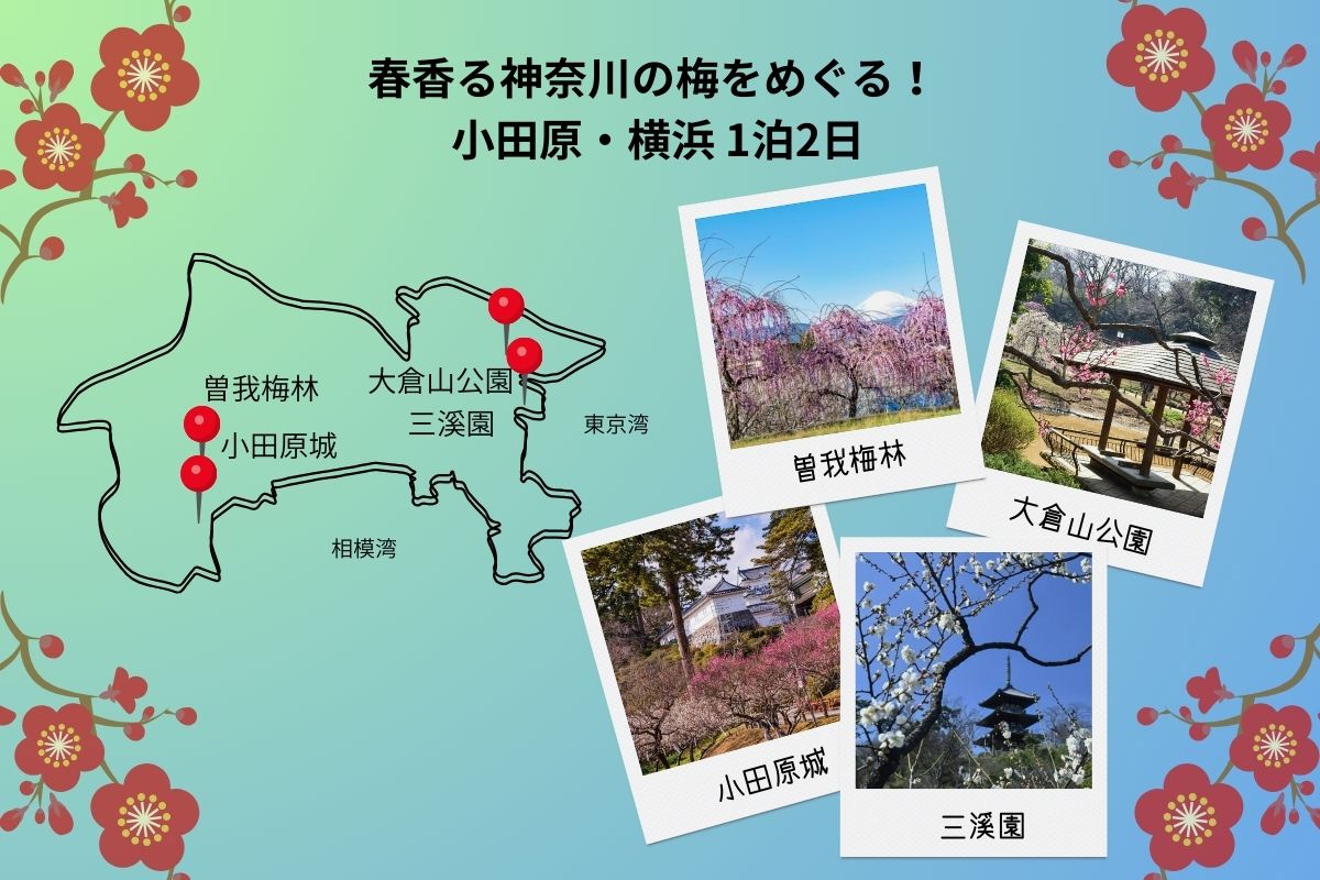 1日目は曽我梅林で梅の絶景を楽しみ、地元名物の梅干しをお土産に。小田原では城下町の風情とグルメを堪能し、宿泊してリフレッシュ。2日目は横浜・三渓園で梅と庭園を楽しみ、中華街でランチ。最後は大倉山公園で静かなひとときを。