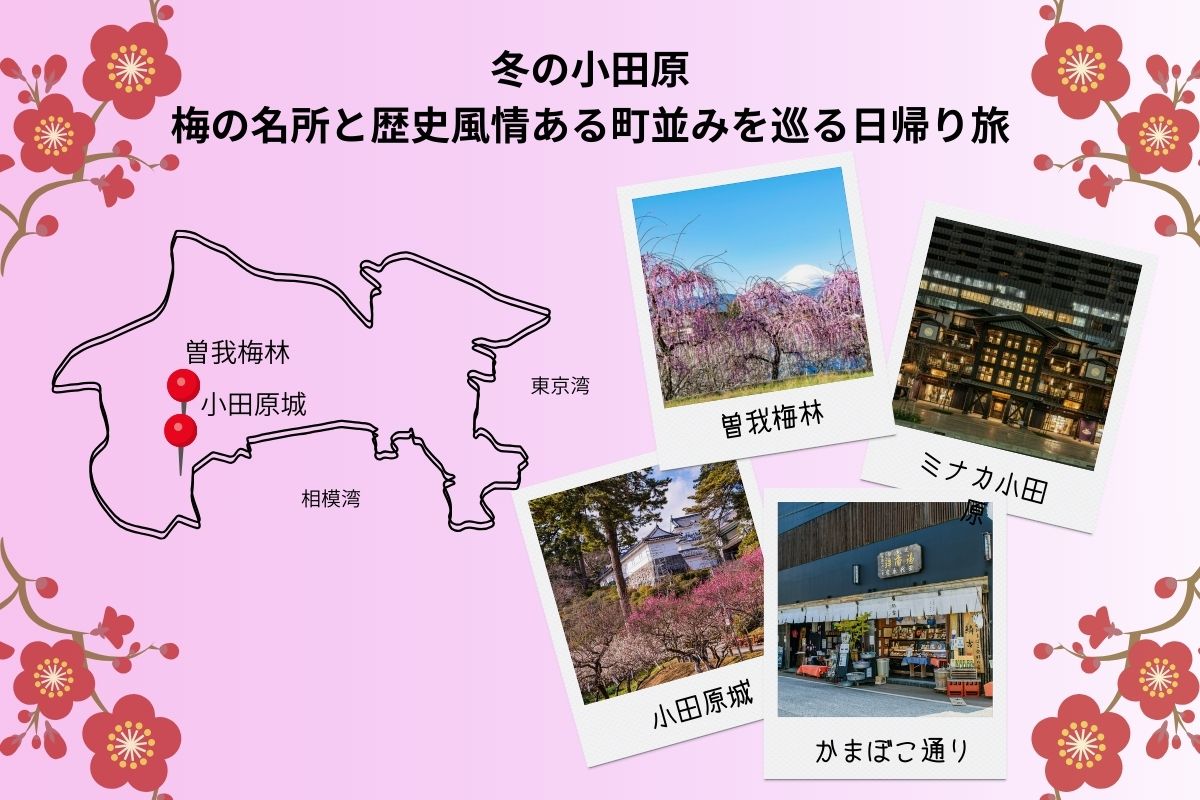 梅の香りを楽しみながら小田原の城下町風情を味わう日帰りプランです。関東屈指の梅の名所・曽我の梅林では、富士山と箱根の山々を背景に咲き誇る白梅の姿が、訪れた人を魅了します。歴史に思いを馳せながら小田原散策をお楽しみください。