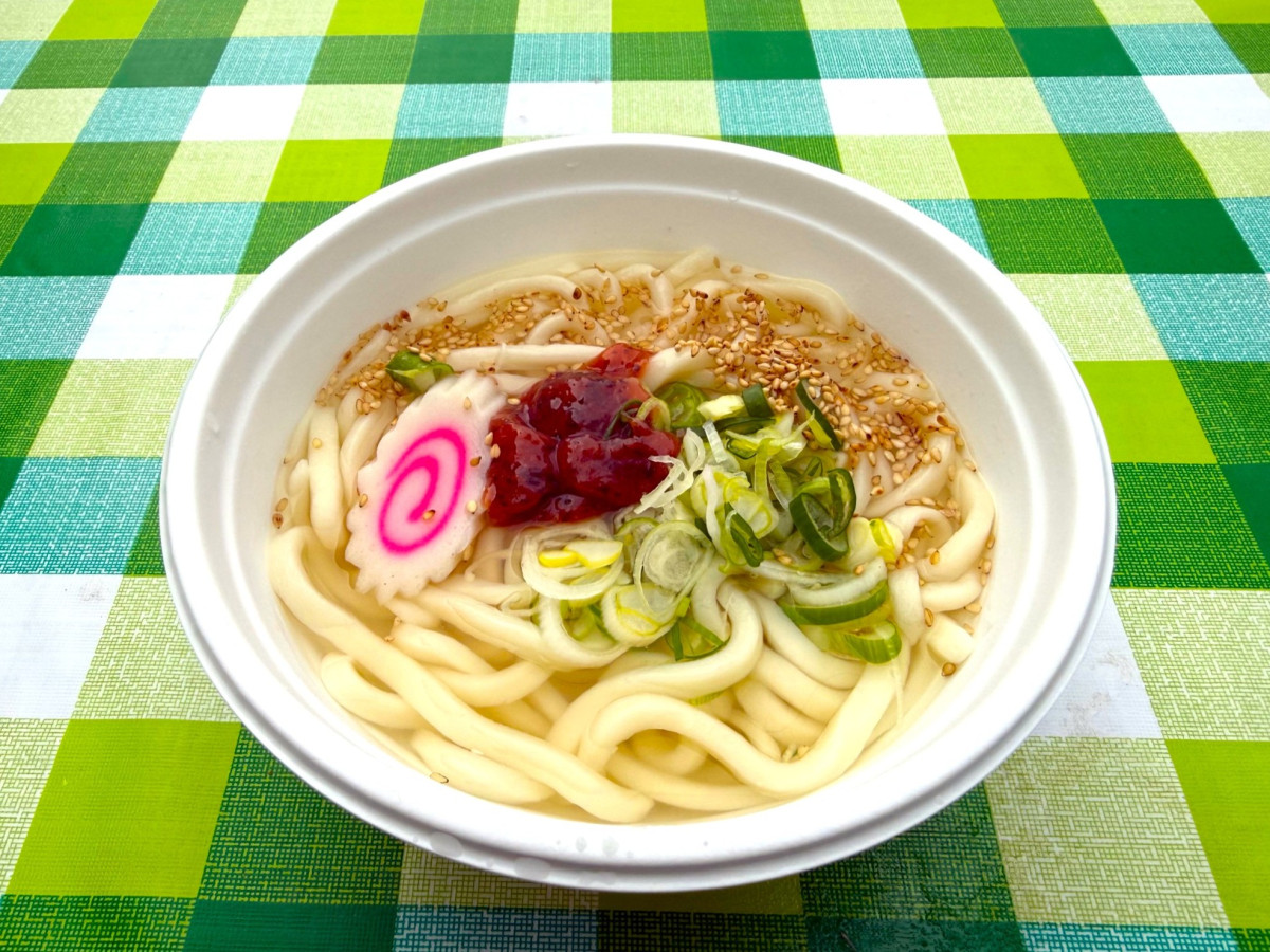 会場では、テーブルと椅子が設置されていたりゴザの貸し出しもされていて、梅の木の下で飲んだり食べたりを楽しめるようになっています。「うめの里食堂」では、名物「梅香うどん」や「梅ごはん」が。2月はまだ肌寒いので、うどんや甘酒が冷えた体を温めてくれます。