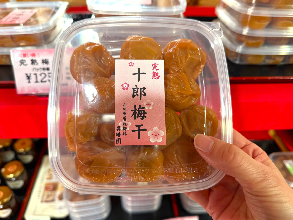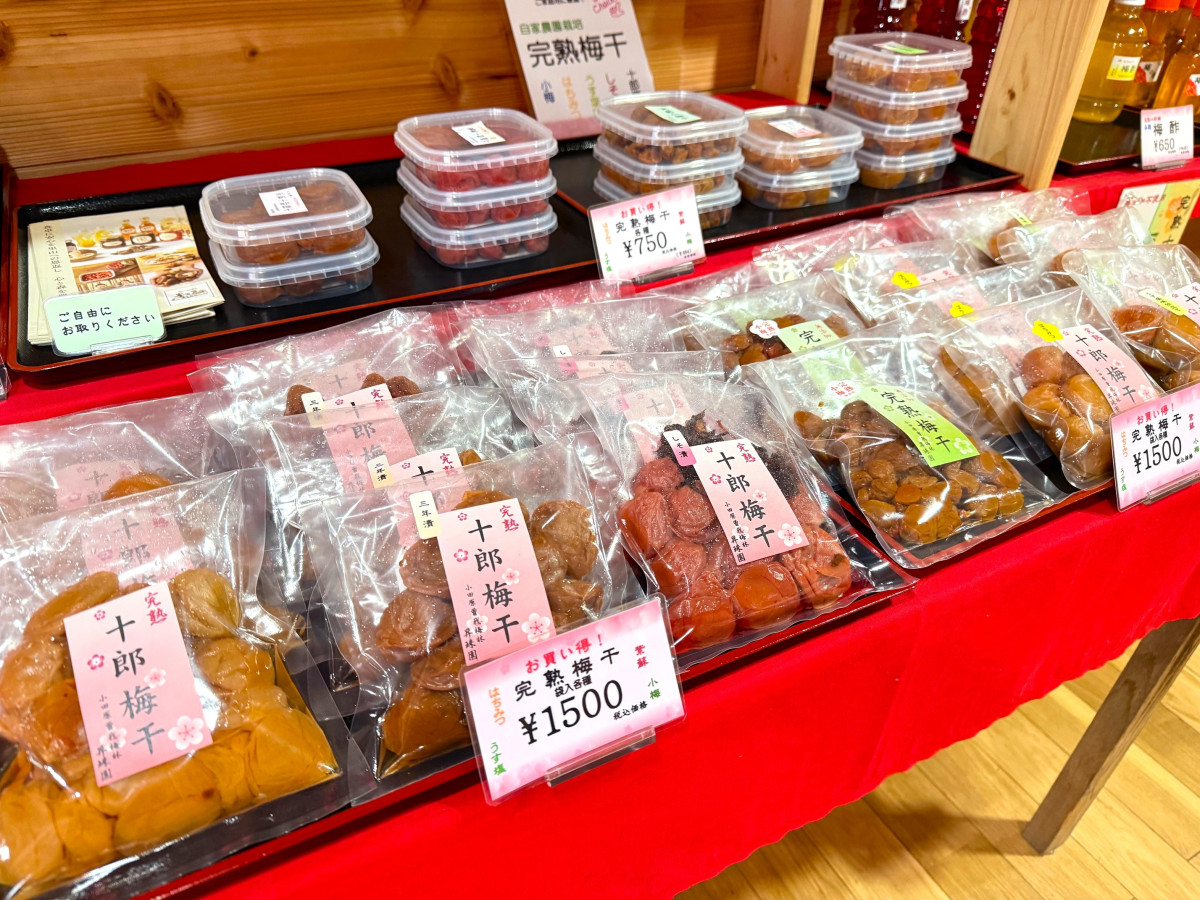 看板商品「完熟十郎梅干し」は、塩の角が取れてまろやかな3年漬け。ふくよかでジューシーな果肉と甘酸っぱい芳醇な香りで、多くの人が買い求めに遠方からも訪れるのだそう。