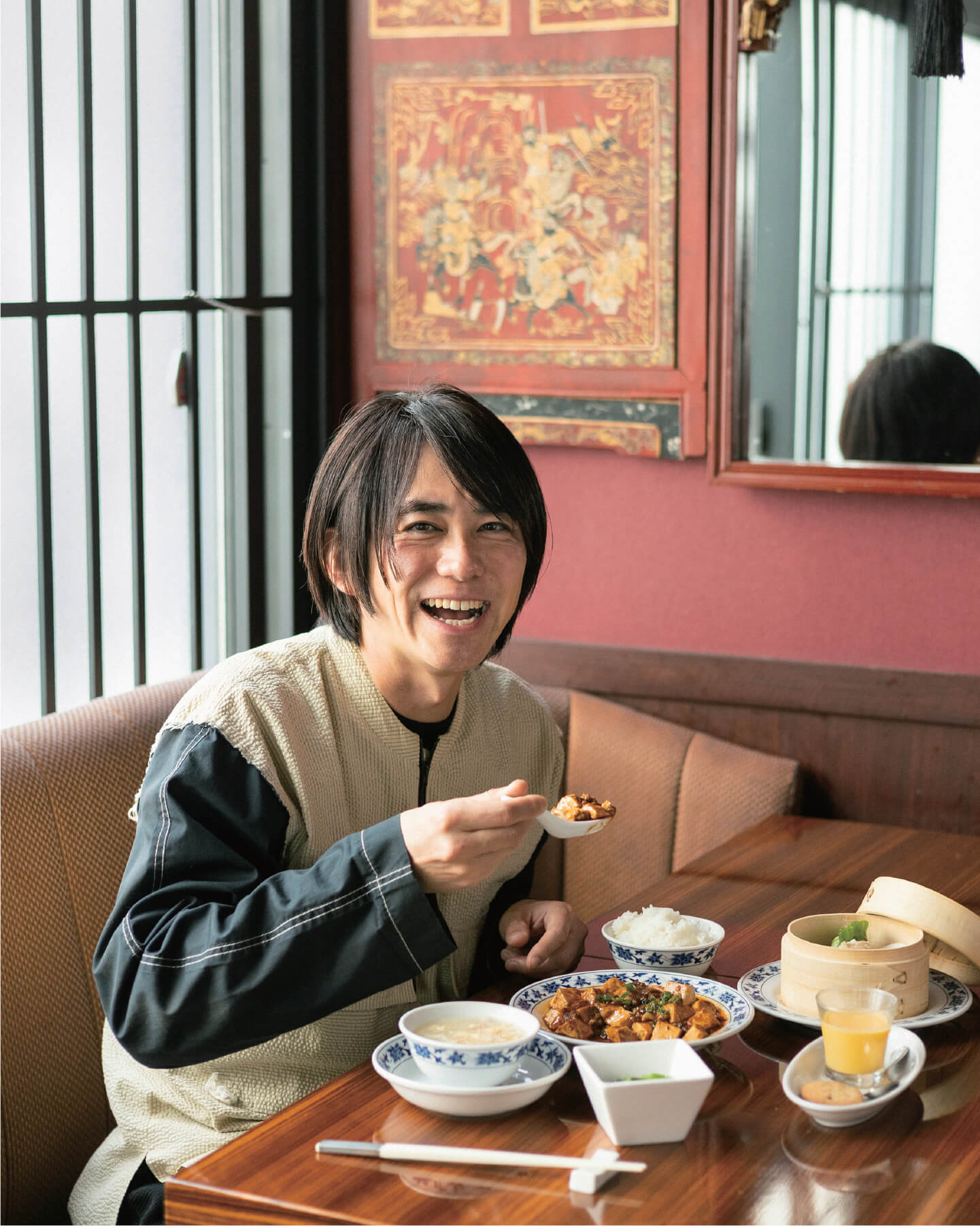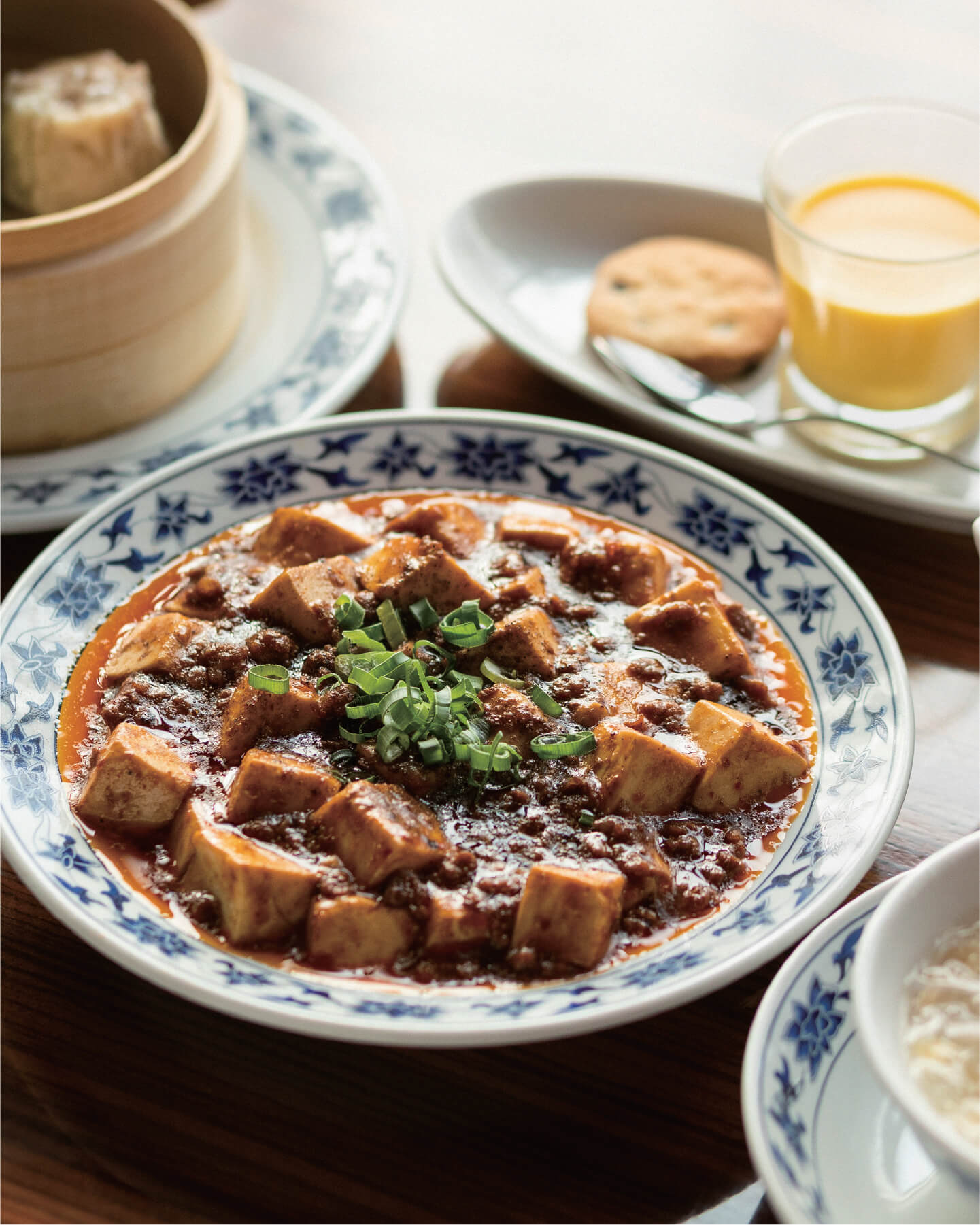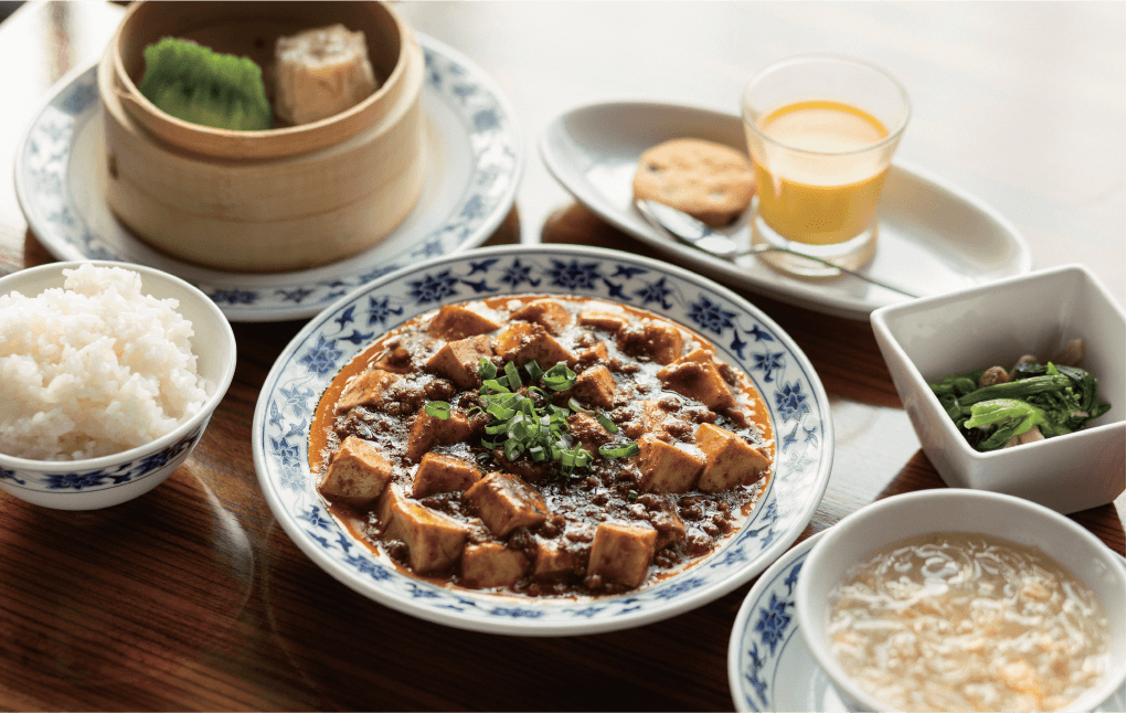 ランチスープ(週替わり)と点心がセットの麻婆豆腐ランチを注文。麻婆豆腐は「花椒のしびれる辛さの中に豚ひき肉の旨味が感じられて、癖になるおいしさです」「そこに点心やスープ、青菜などの優しい料理が組み合わされていて、辛さと優しさを行き来しながら食べられます」とミネさん。メニューは昼・夜ともにコースとアラカルトが注文可能。