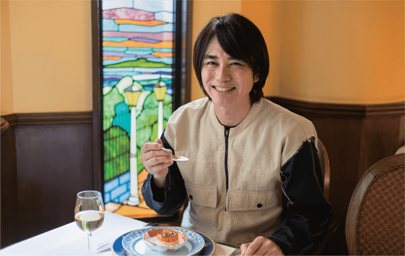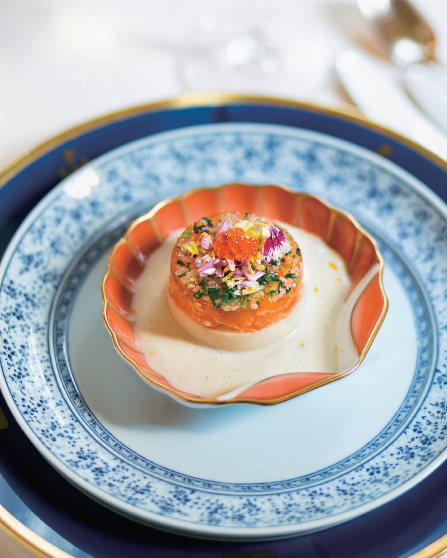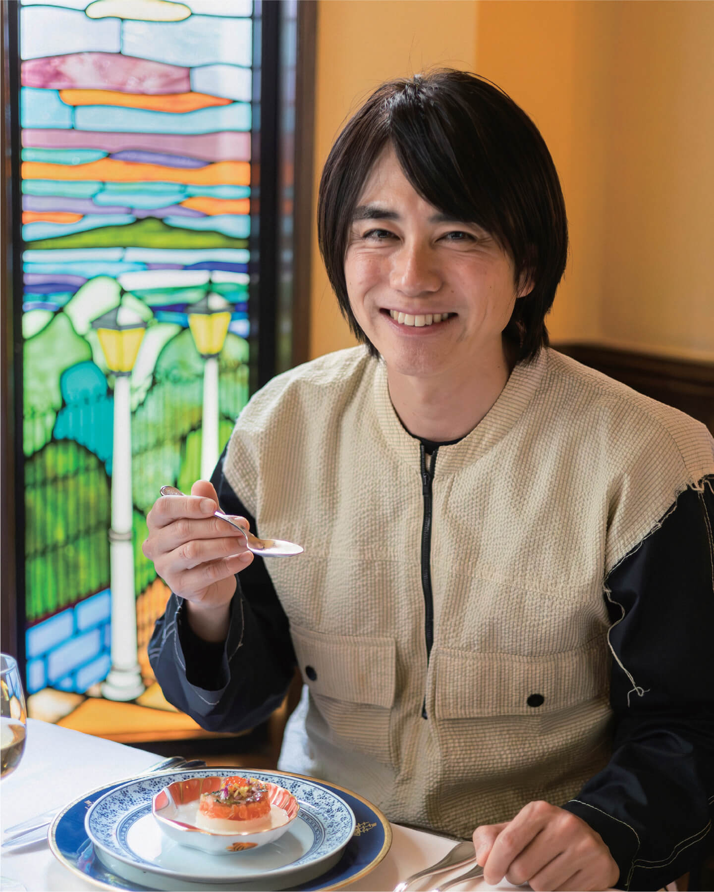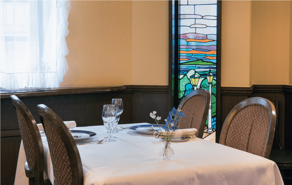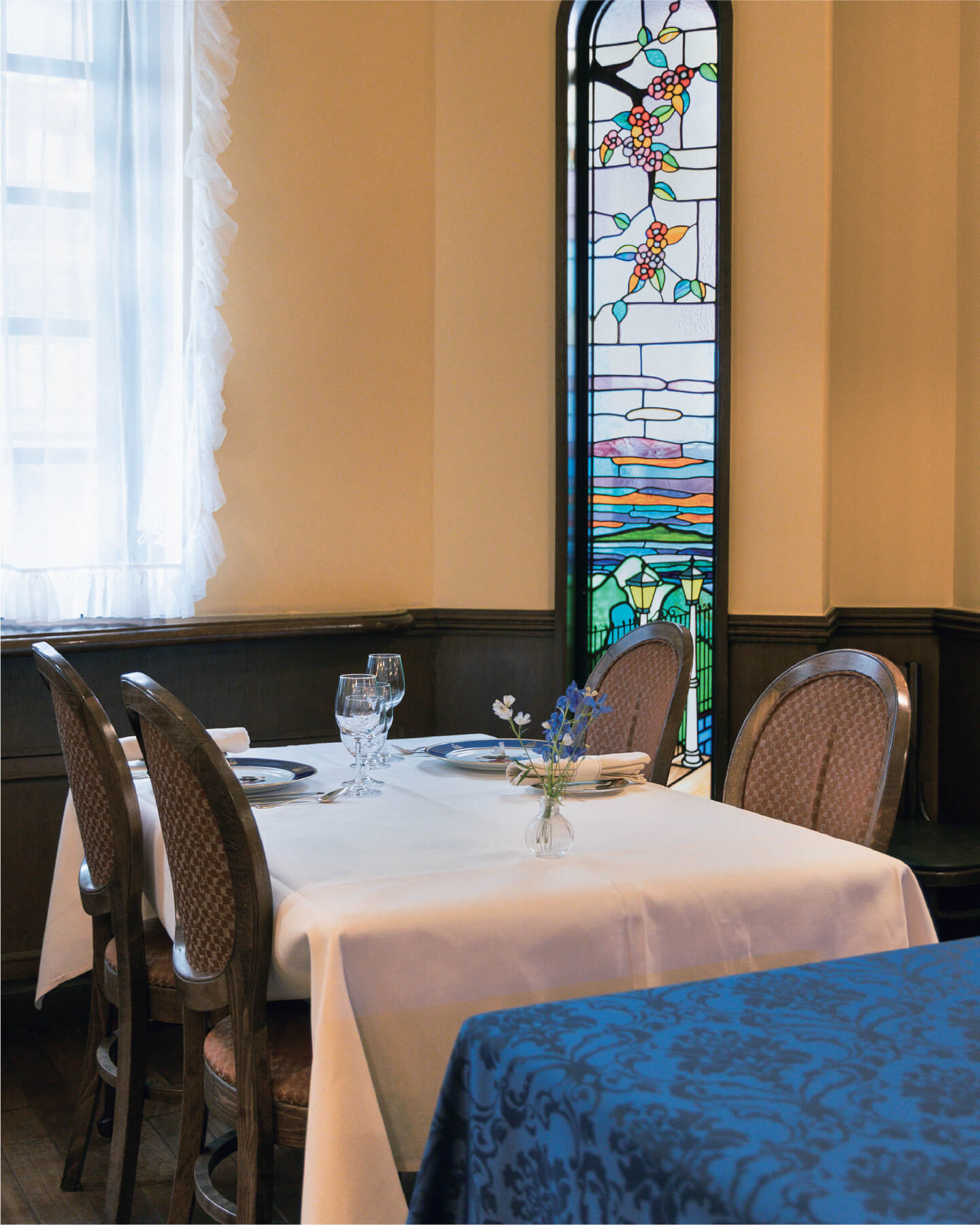 日本人の口に合うフランス料理が楽しめる。昼夜ともに楽しめるコース料理の中でも長く愛されているのが、旬の食材を使った季節替わりのブランマンジェ。今回は富士トラウトの燻製マリネ 豆乳のブランマンジェをいただく。素材が何層にも重なった、宝石のような美しさに感銘を受ける。「素材や組み合わせの細やかな工夫が感じられ、フレンチ特有の“マリアージュ”の妙を体験できます。素材そのものの美味しさを前面に出す料理というよりも、さまざまな要素を組み合わせて一つの世界を作る、いわば編集的な料理だと感じました」とミネさん。控えめながら品のある照明やステンドグラス、テーブルの花や美しい器など、空間から横浜らしい上品さが感じられる。「料理と空間が調和していて、ゆっくりコース料理を楽しみたくなるようなお店だと思います」と、大絶賛で締めた。