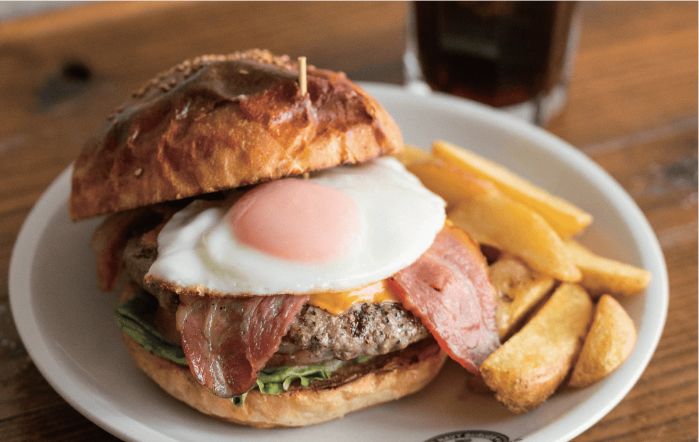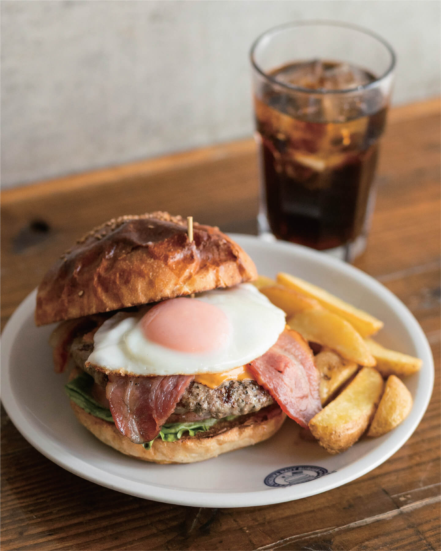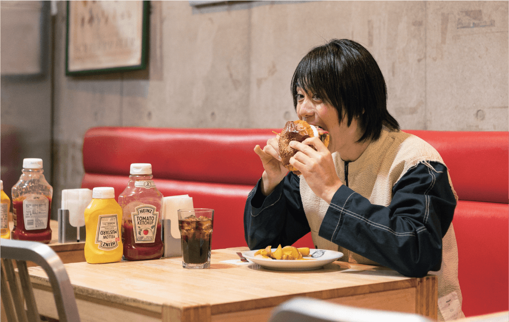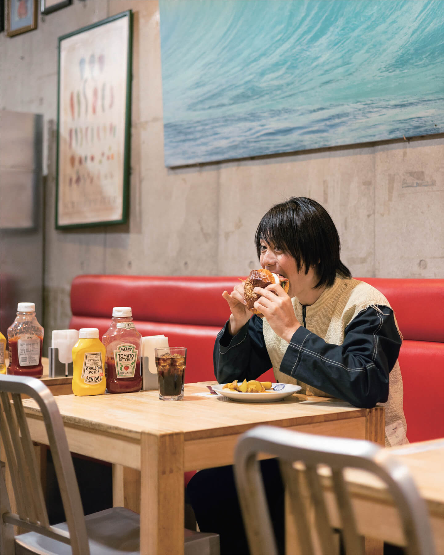 ボリュームたっぷりで迫力がある、ジョージワシントンバーガーを注文。豪快に、大口をあけてひとたび頬張ると「バンズがとってもふわふわで美味しい。牛肉100%のパテもベーコンも非常に分厚くて、肉の旨味がガツンときます」と、食べる手が止まらない様子のミネさん。添えられたフレンチフライもからっと揚がっていて、いいバランス。「1日でこれだけ多様な食を楽しめるのは、昔から外の文化が入ってくる神奈川ならでは。すごく贅沢な体験ですね」と満足気。