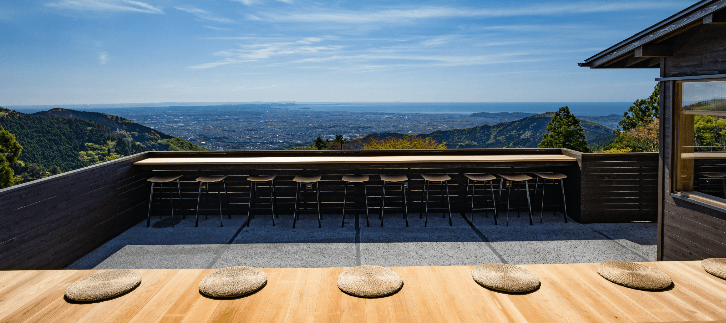 大山阿夫利神社下社にある茶寮。相模湾が目の前に広がるテラス席や趣のある店内からは、天気がよければ房総半島や伊豆大島まで見渡せる。名物のコーヒーは、長命延寿の水として愛され続けてきた、大山阿夫利神社の御神水で淹れている。豊富なミネラルと、甘さが特長の御神水は、汲んでいく人も多いのだとか。