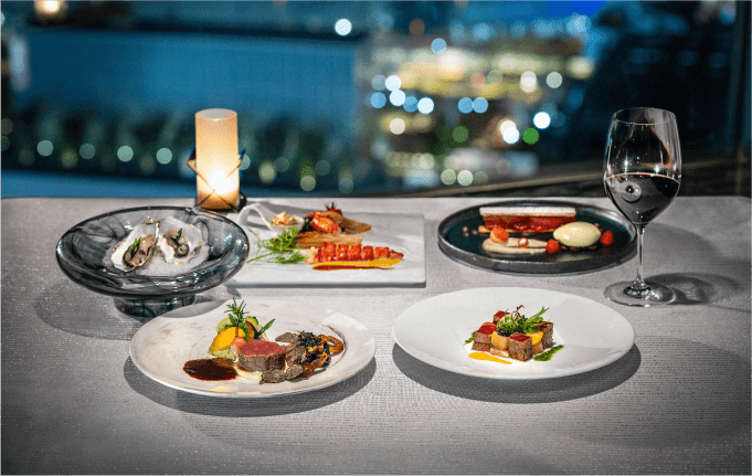 横浜ベイシェラトンホテル最上階にたたずむ本格フレンチ。吟味された素材と洗練の技が織りなす一皿を、きめ細やかなおもてなしとともに堪能できる。ベイエリアの夜景と生演奏が、特別な時間を優雅に彩ってくれる。横浜の街並みや横浜港を一望できるパノラマビューは大切な人との楽しい食事にさらに付加価値を与えてくれる。
