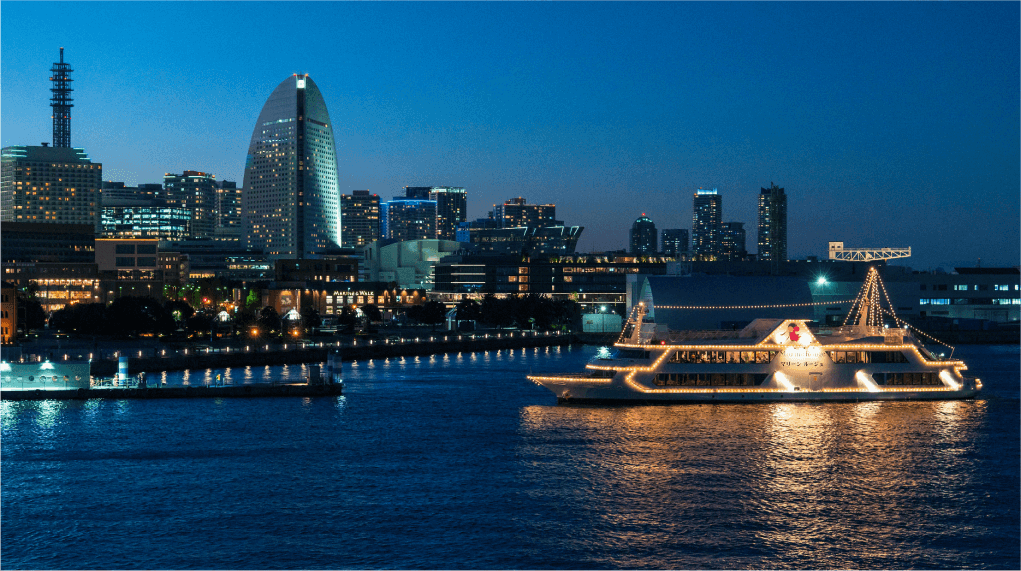 横浜港を出航し、夜景に包まれる海上を進むディナークルーズ船は、赤レンガ倉庫を19時30分に出航。みなとみらいやベイブリッジを望みながら、フレンチのコース料理を楽しめる。時間とともに表情を変える景色が、食事の余韻をより深いものに。