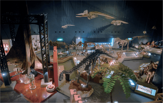 神奈川県立生命の星・地球博物館は、46億年の地球の歴史と生命の多様性を展示した自然系博物館です。恐竜の骨格や隕石など1万点以上の実物標本で学ぶことができ、ティラノサウルスの巨大な化石から昆虫まで、迫力ある展示が特徴で、子供から大人まで一日中楽しめる家族連れに人気のスポットです。 エントランスを抜けると、天井の壮大な宇宙波の絵や、恐竜の骨格標本が出迎えてくれて、 地球誕生の神秘的な世界へ探検できます。