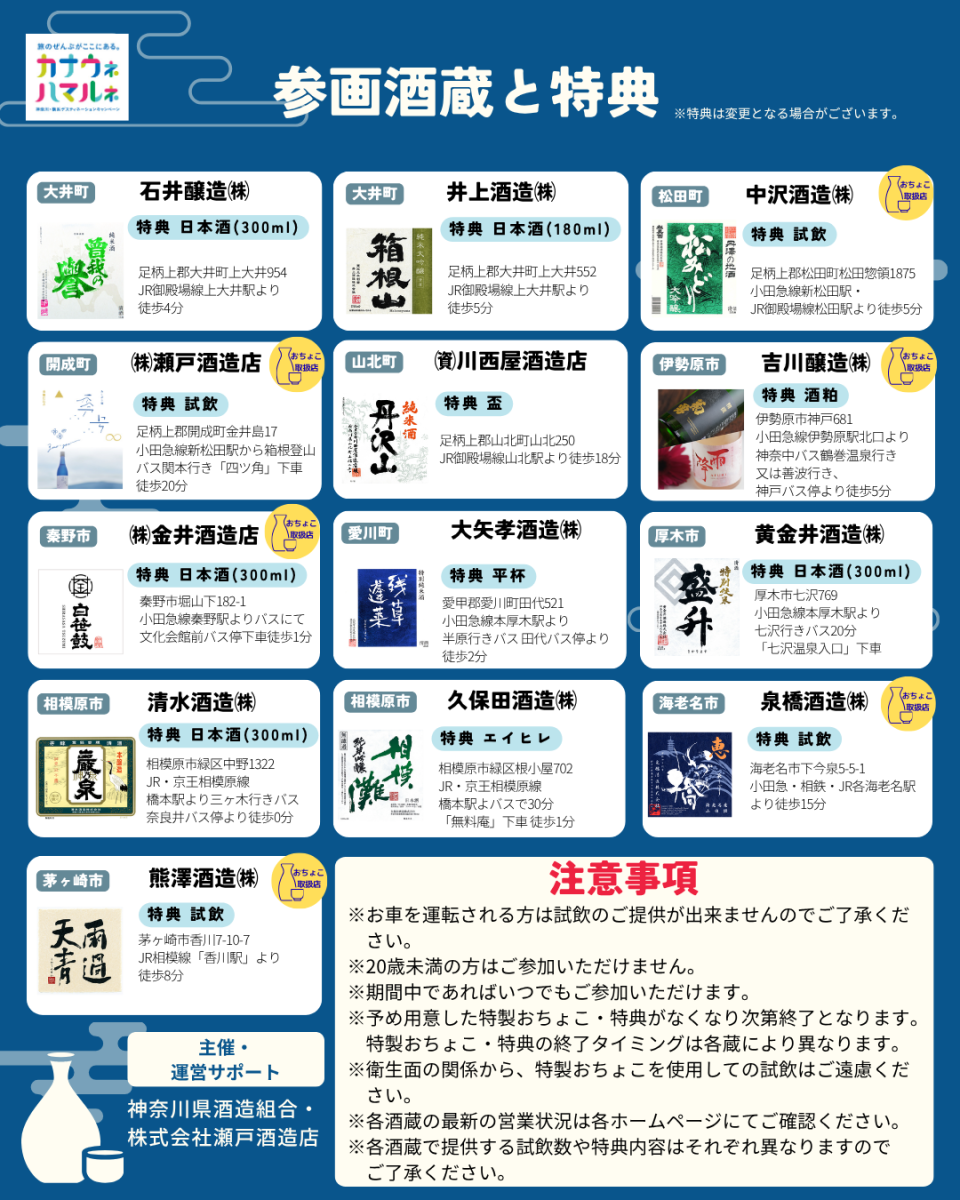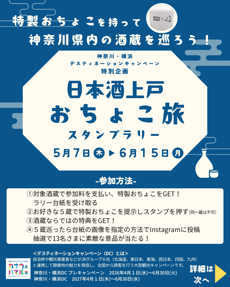 DCロゴの入った「特製おちょこ」を購入すると、県内に点在する13の酒蔵で試飲や酒蔵ならではの特典が受けられる特別企画(特典は5蔵まで)です。おちょこを片手に酒造をめぐりながら神奈川の日本酒文化を体験できます!400個の数量限定販売ですので、お早めに!