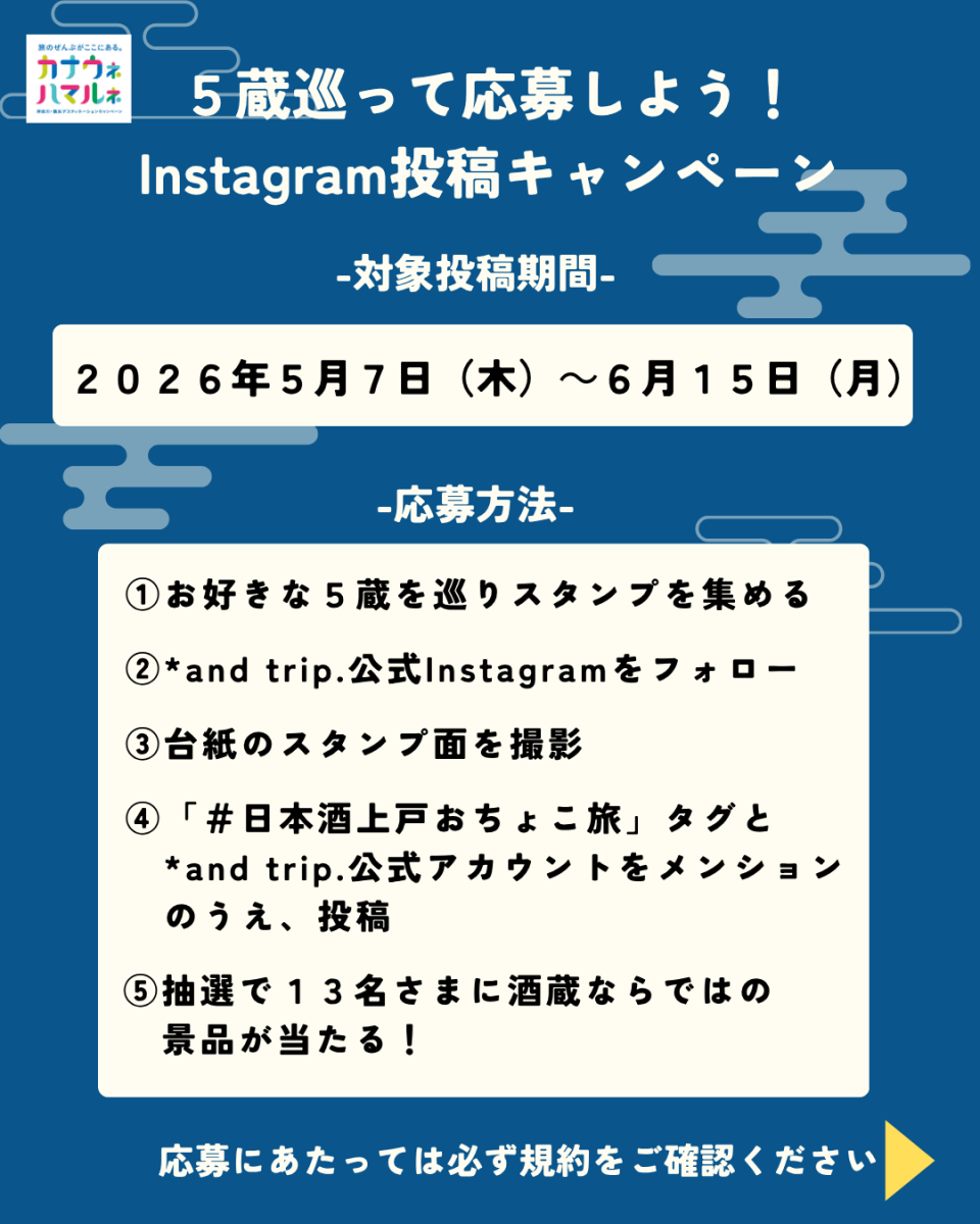 また、5蔵のスタンプを集めてSNSに投稿すると、抽選で酒蔵にまつわる景品が当たります!