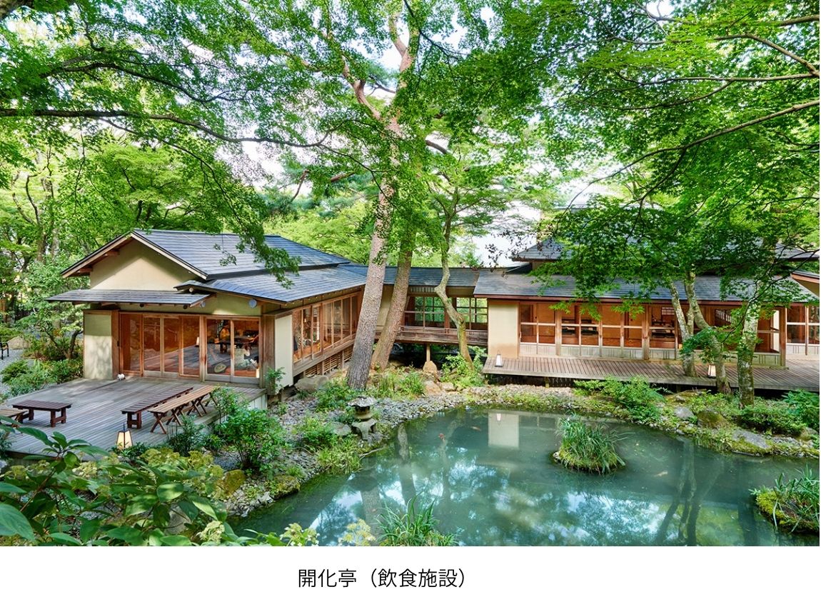 四季折々に変化を見せる庭園や、飲食施設「開化亭」、100%源泉かけ流しの足湯カフェなども楽しめます。