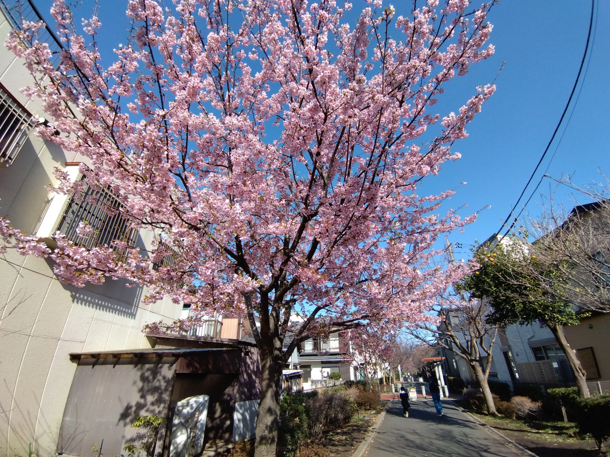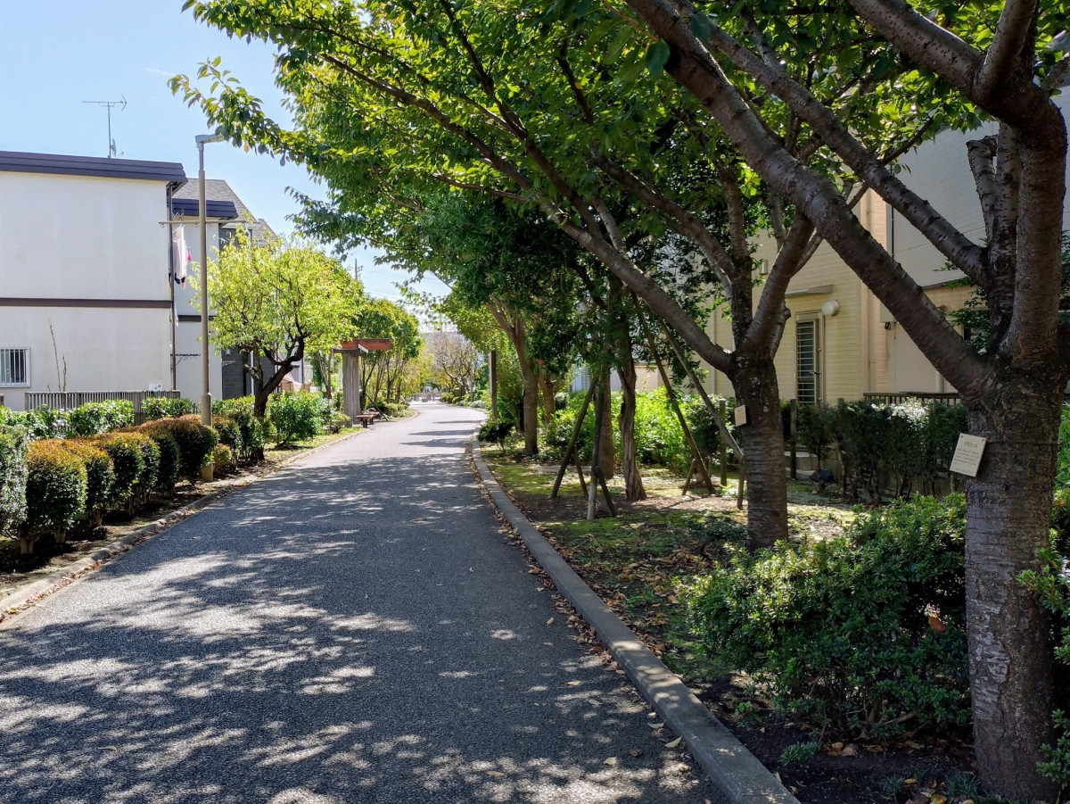 住宅街の中に続く散歩道。春には多種多様な桜を楽しめる。