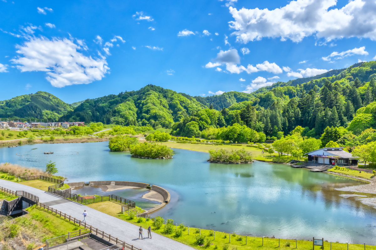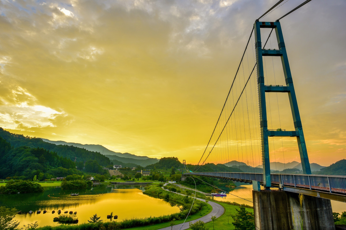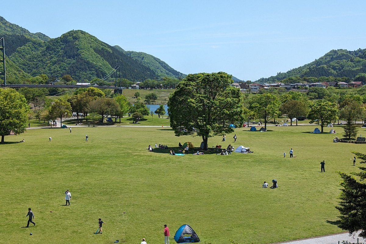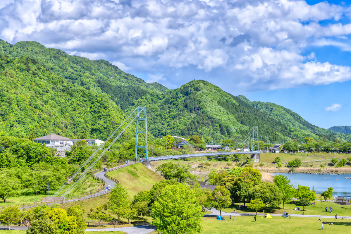 丹沢の山々に抱かれた、清川村のオアシス「宮ヶ瀬湖畔園地」は、エメラルドグリーンの湖面と鮮やかな緑が織りなす、絵画のような風景に包まれたスポット。広大な「けやき広場」は、見渡す限りの芝生が広がる開放的な空間。レジャーシートを広げてピクニックを楽しんだり、園内を走る愛らしいロードトレイン「ミーヤ号」で風を切ったりと、のんびりとした時間が流れます。また、ランドマークである長さ315mの「水郷大吊り橋」からは、まるで空中散歩をしているかのようなスリルと、360度の大自然を満喫できます。