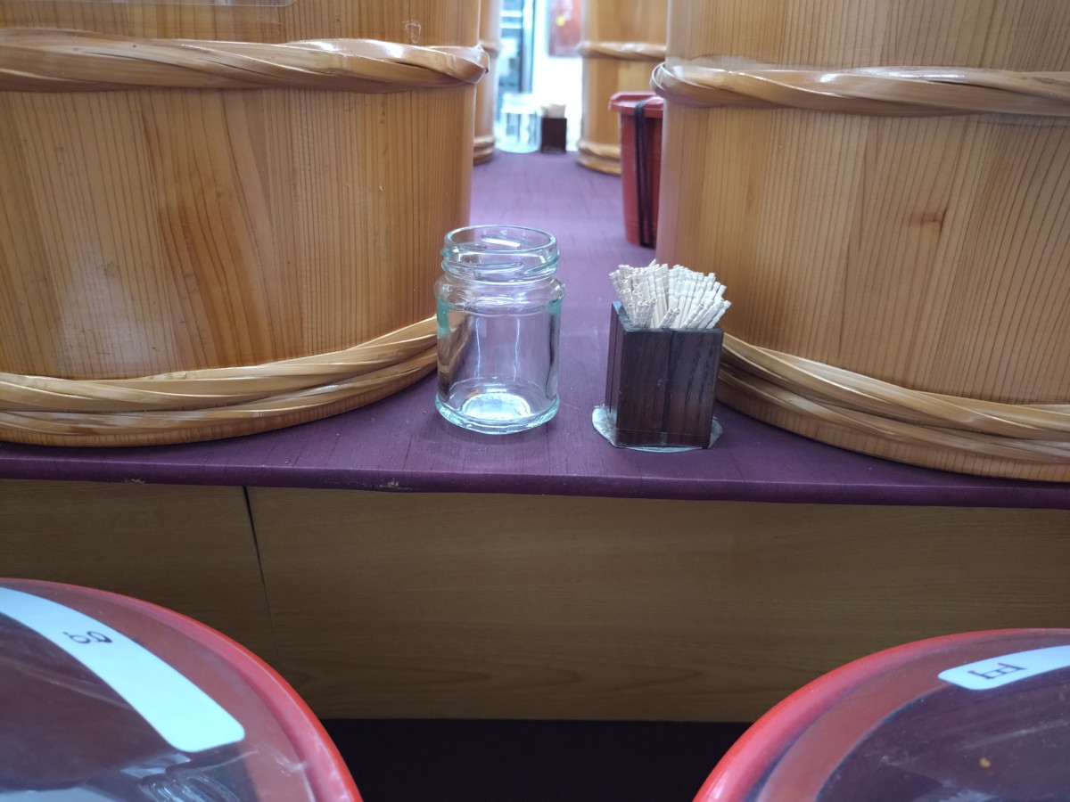 味噌桶の蓋の上部に溜まった香りを嗅いで、気になった味噌は楊枝で試食できます。