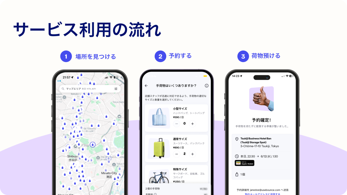 提携している店舗の空きスペースを活用し、旅行者や利用者の手荷物を一時的に預かるサービスです。店舗は空きスペースを収益化でき、利用者は必要なタイミングで安心して手荷物を預けられます。利便性と効率性を兼ね備えた、地域密着型の手荷物預かりソリューションです。