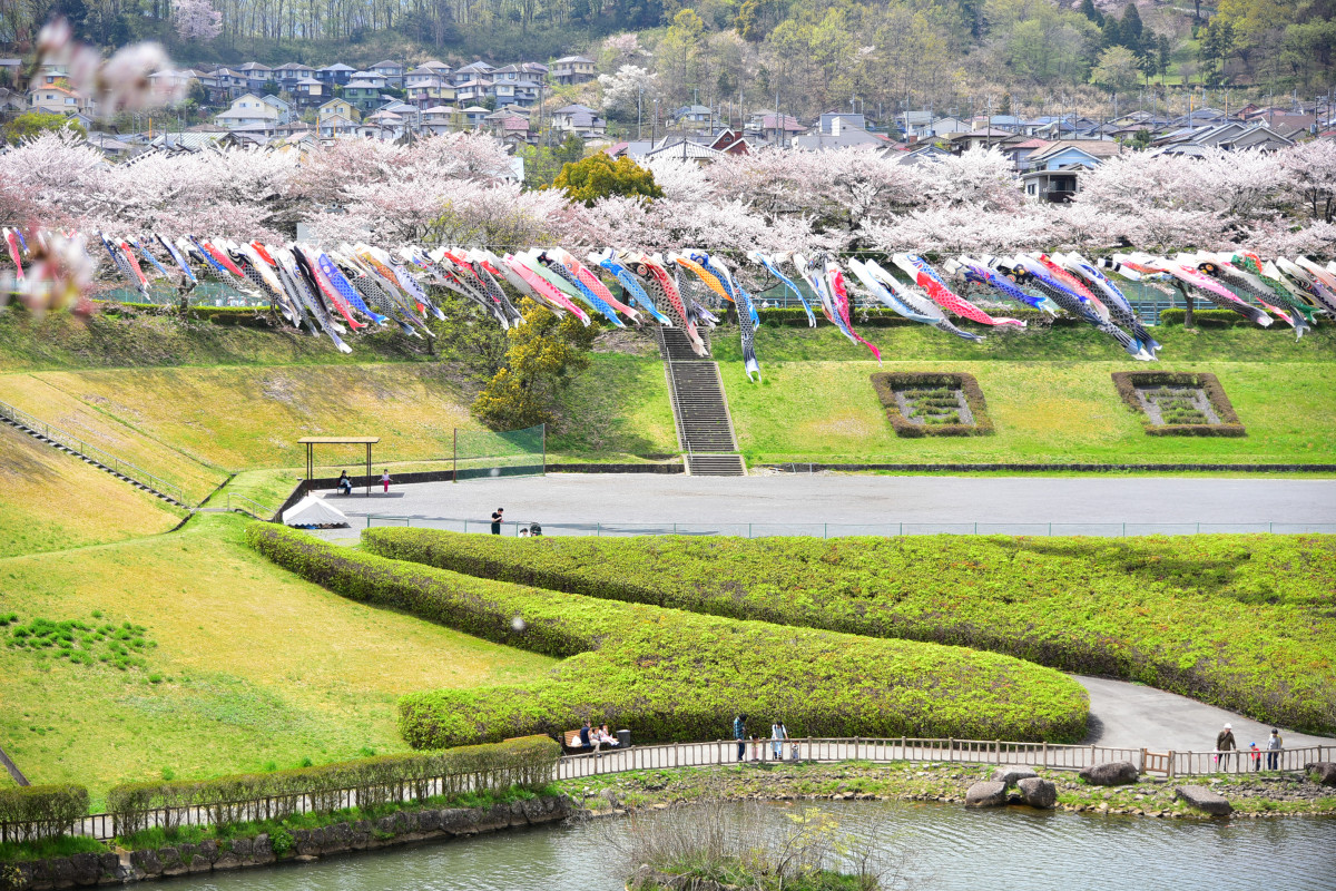 広い芝生広場や野外ステージ、テニスコートがあり、幅広く楽しむことができます。西側には「D51形蒸気機関車(1119号機)」が展示されています。南側の「若宮橋」のたもとには調整池があり、洪水時には川の下流に流入する水の量を抑えるよう設計されています。4月から5月に揚がる鯉のぼりは見応え十分です。