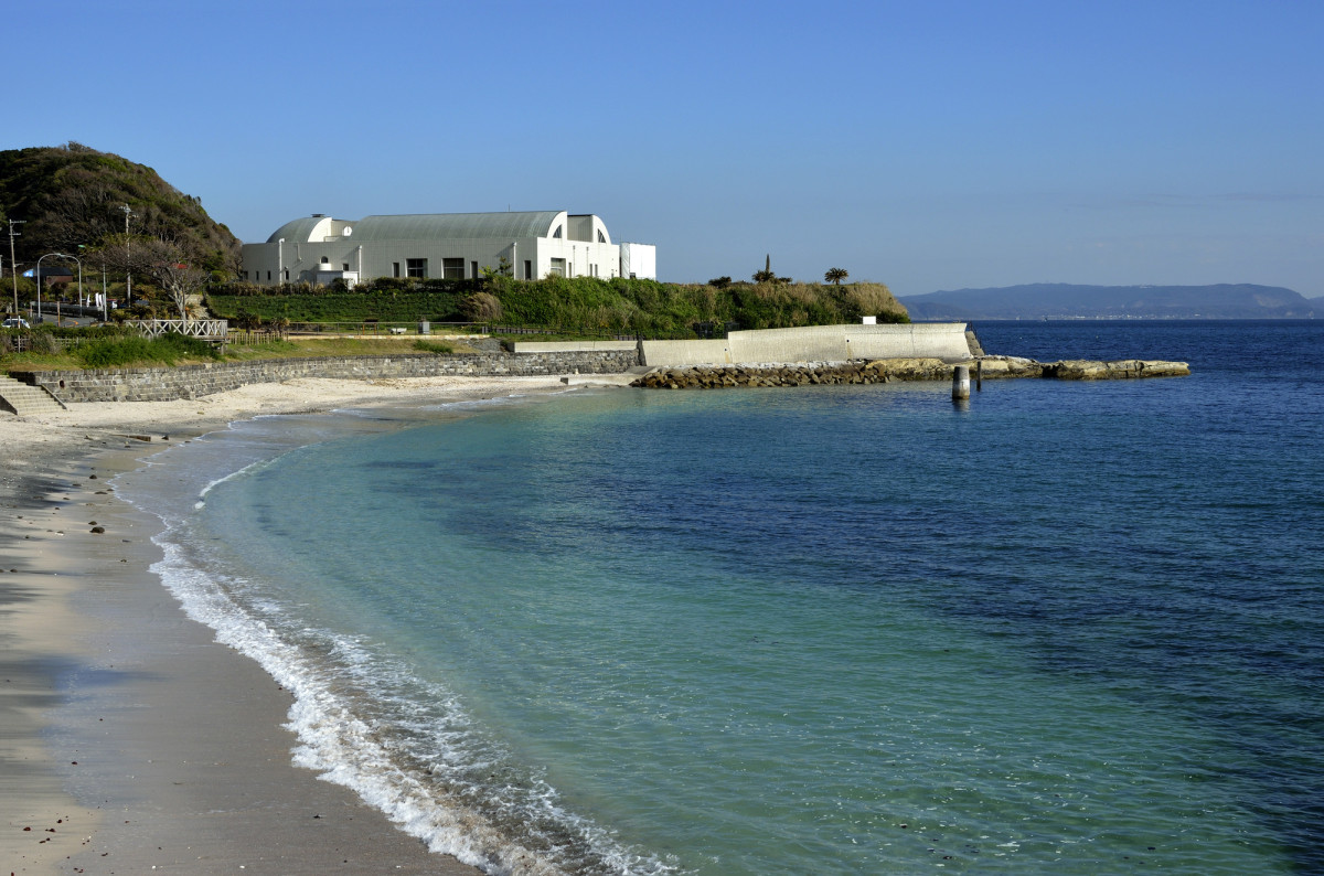 三浦半島では数少ない、白砂の浜辺です。昭和29年、初代ゴジラがこの浜辺に姿を現わしました。現在では、その足跡が残されています。