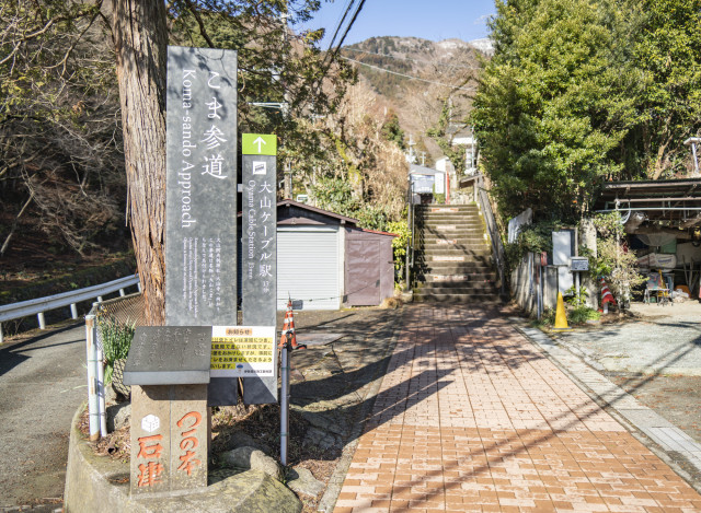 大山詣に向かう際、大山ケーブルバス停からケーブルカー乗り場(大山ケーブル駅)までの石段を「こま参道」と呼んでいます。土産店や宿坊のほか、大山こまの工房、大山豆腐を使った食事処などが軒を連ねる参道です。