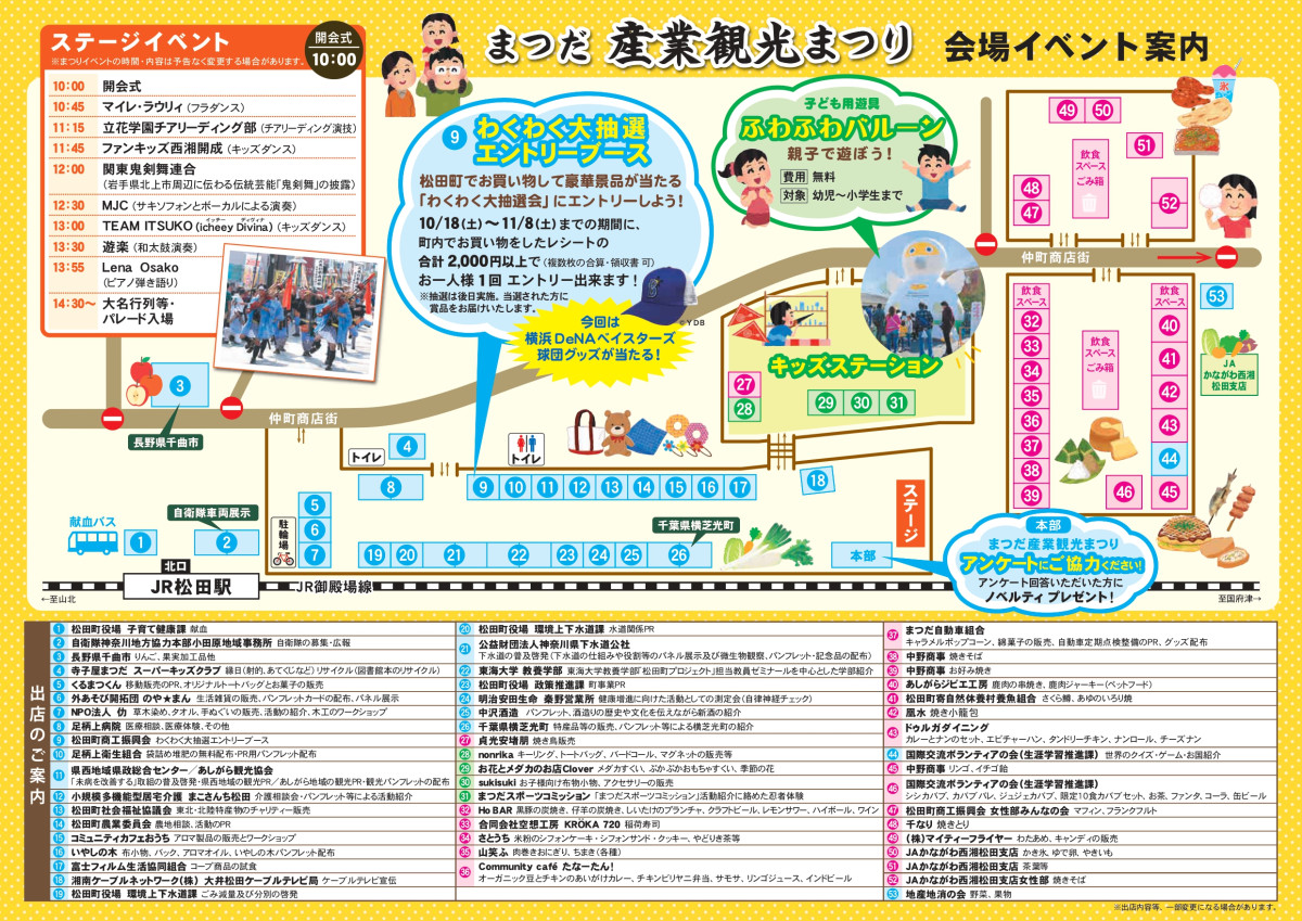 松田町の特産品やグルメ、大人気の姉妹町「千葉県横芝光町」のねぎの販売、ステージイベントやガラガラ大抽選会にエントリー企画など盛りだくさんの内容です。