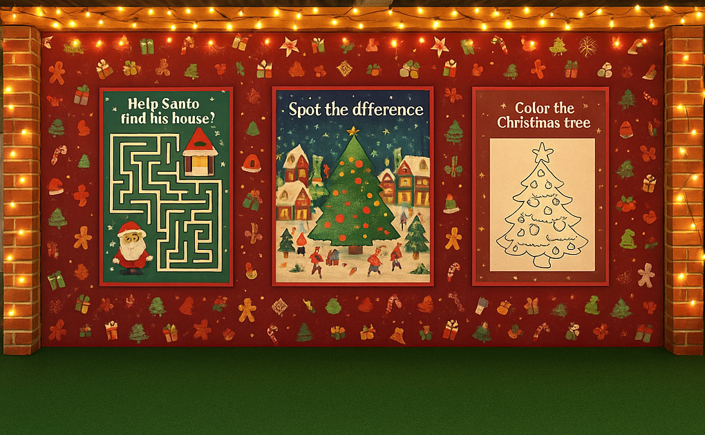 「Kids Area(キッズエリア)」の一部には人工芝を設置し、お子さまが普段公園に遊びに来たときのように体を動かして遊べる空間を作り出します。壁面には「サンタの家までたどり着く迷路」「間違い探し」「サンタクロースを探せ!」など、つい遊びたくなる仕掛けを掲示予定です。