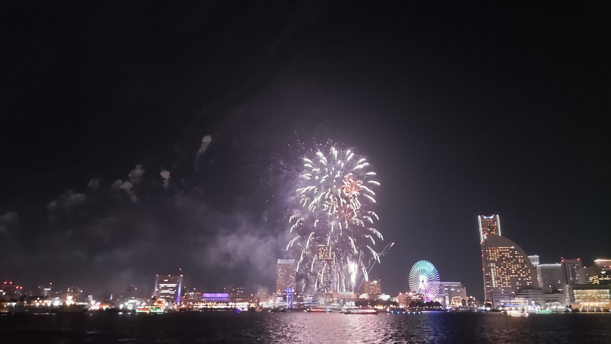 工場夜景を楽しまれた後は、幻想的な輝きに包まれた横浜港で、「横浜ナイトフラワーズ」 の花火を船上から鑑賞。
